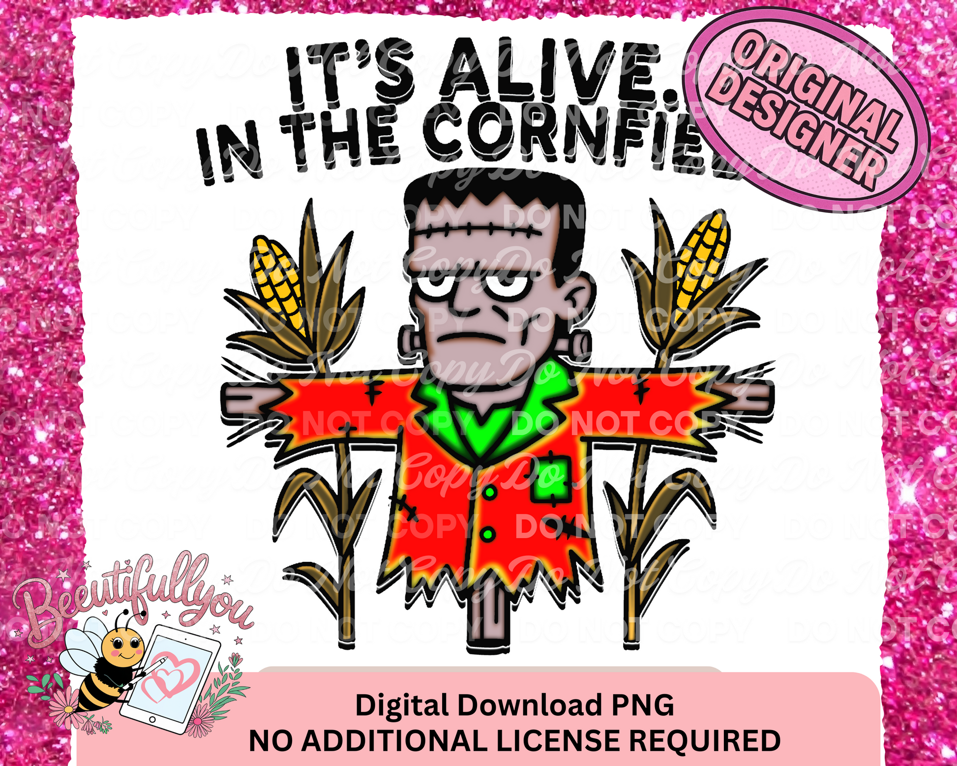 Your fields just got freaky! This hilarious “It’s Alive in the Cornfield” digital design features a stitched-up Frankenstein scarecrow surrounded by corn stalks—perfect for your spooky fall creations. Great for tees, signs, bags, and more!