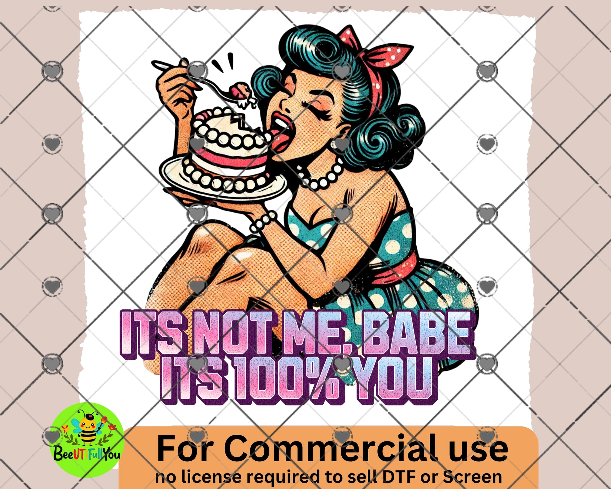 Add a dash of humor and vintage charm to your projects with this "It’s Not Me Babe, It’s 100% You" design. Featuring a retro-style pinup enjoying a slice of cake, this artwork is perfect for those who appreciate a playful twist in their creations.