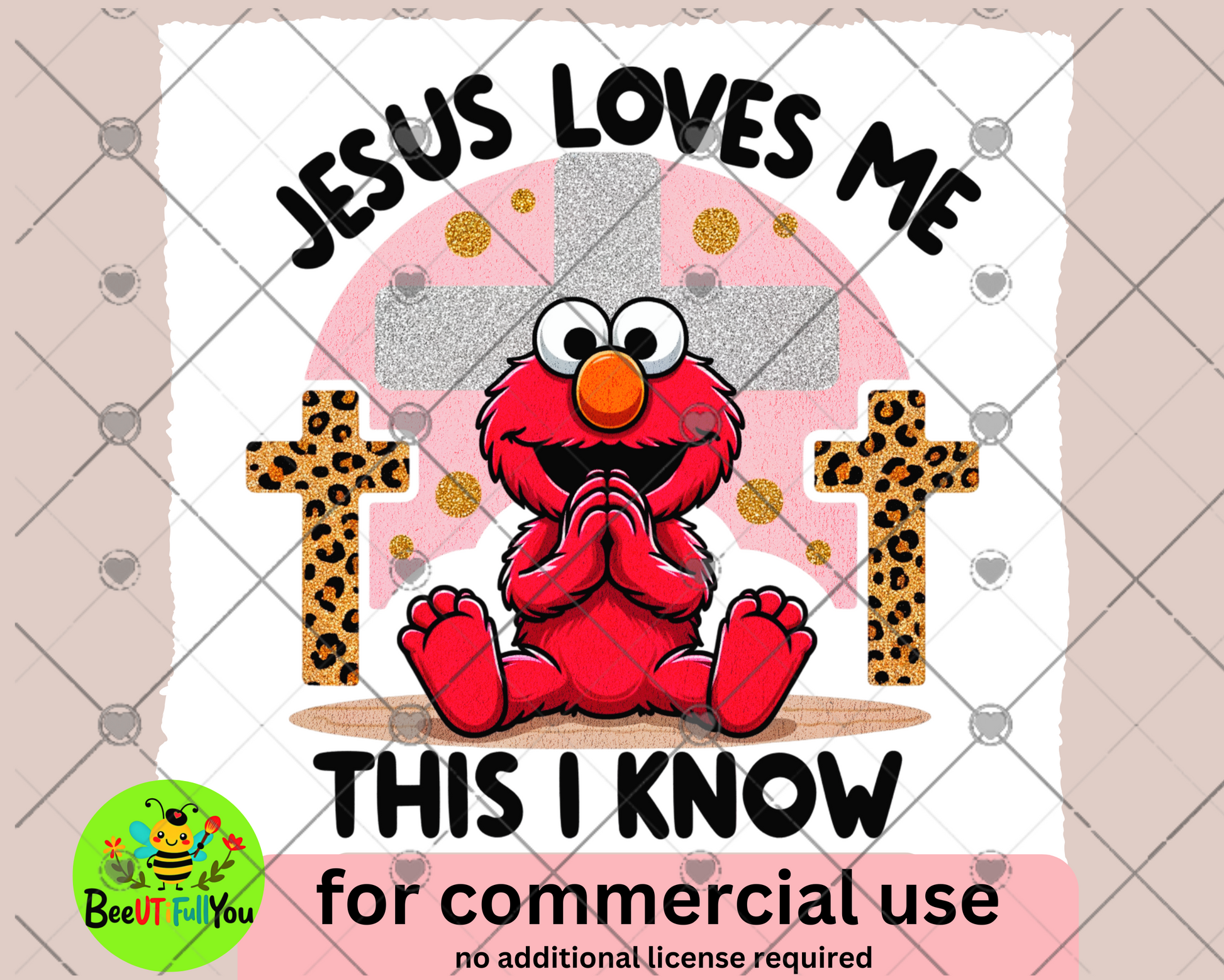 This adorable and inspirational PNG design features a beloved red cartoon character sitting with hands clasped in prayer, surrounded by two leopard print crosses and glittery accents. The text "Jesus Loves Me This I Know" is prominently displayed, making it a perfect design for faith-based projects. This design is property of Beeutifullyou and should not be copied or altered in any way. It is intended for use on physical items only, and selling the digital download is strictly prohibited. Ideal for creating t-shirts, mugs, and other merchandise, this design comes with a commercial use license, no additional license required.
