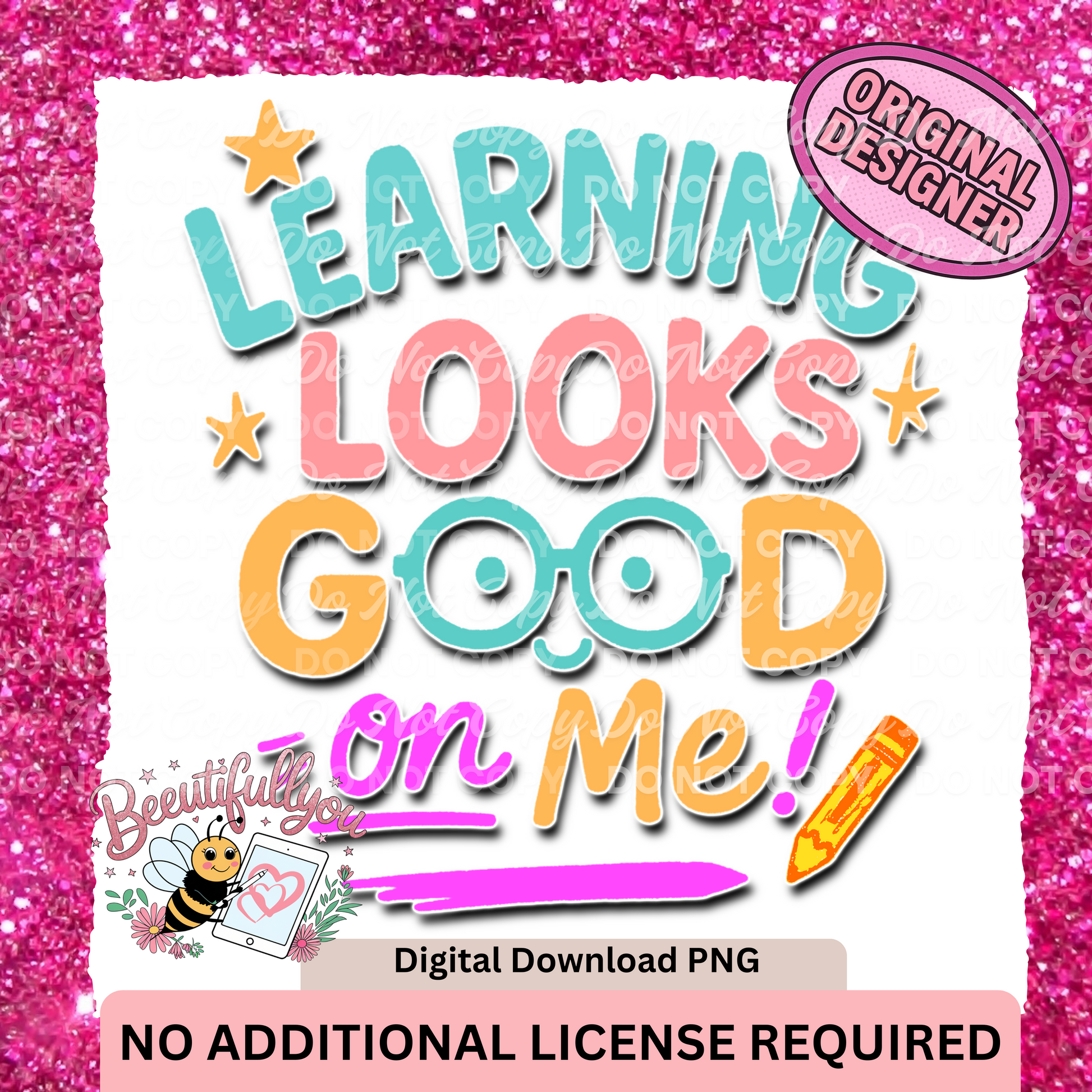 Celebrate confidence and cuteness with this colorful “Learning Looks Good on Me!” PNG! Perfect for students, teachers, or school staff, this playful design features chunky lettering, crayon-style accents, and adorable glasses built into the word “GOOD.”