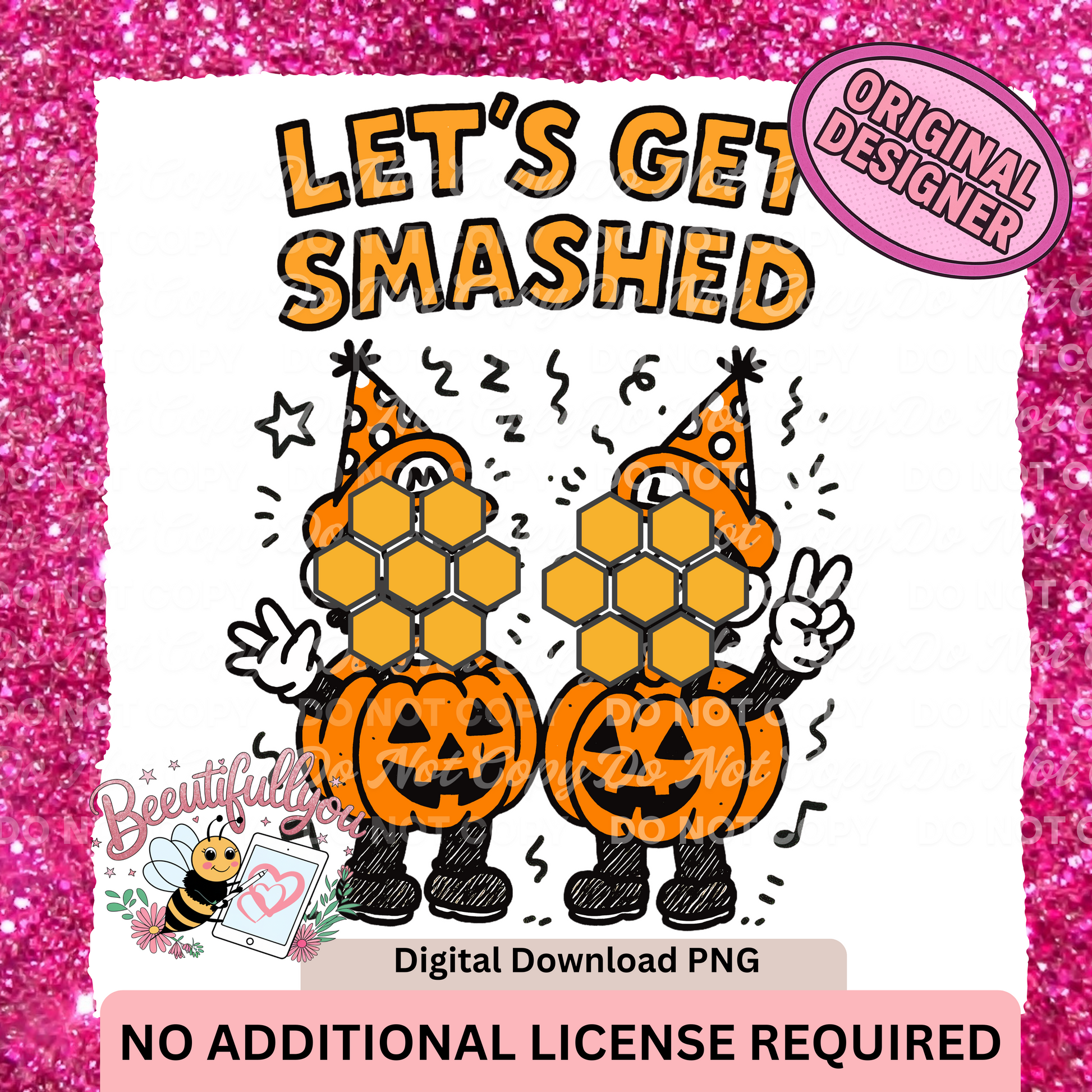 This PNG features two pumped-up party pumpkins dressed as everyone's favorite mustachioed brothers—complete with hats, party horns, and peace signs. The bold orange and black text shouts “Let’s Get Smashed,” making it perfect for adult Halloween shirts, bar crawl merch, or party favors.