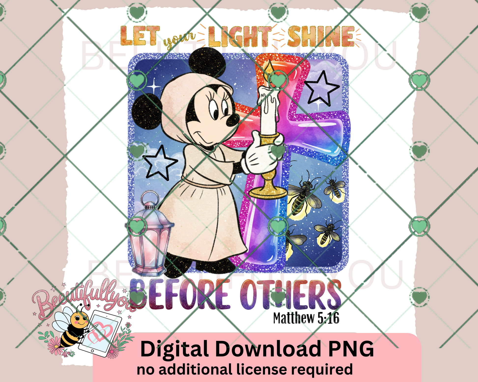 This faith-filled digital download features a sweet, vintage-inspired character holding a glowing candle, set against a radiant cross, fireflies, and twinkling stars. The quote from Matthew 5:16, "Let your light shine before others," encourages kindness, faith, and living with purpose.