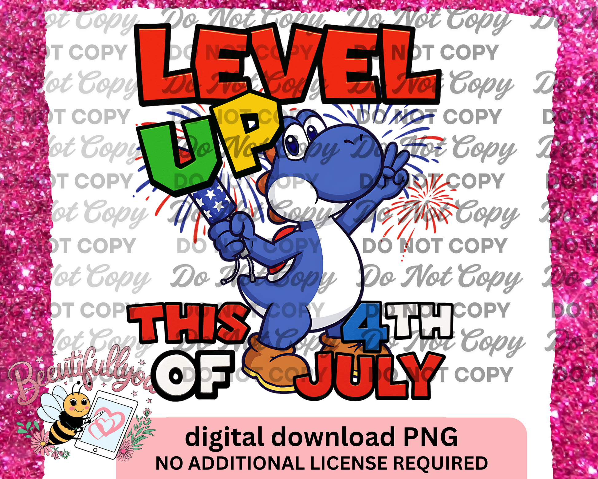 Power up your holiday vibes with this Level Up This 4th of July PNG! Featuring a retro video game dino holding a firework, surrounded by pixel-style font and explosions of red, white, and blue, this design is perfect for gamers, kids, and 4th of July fans alike.