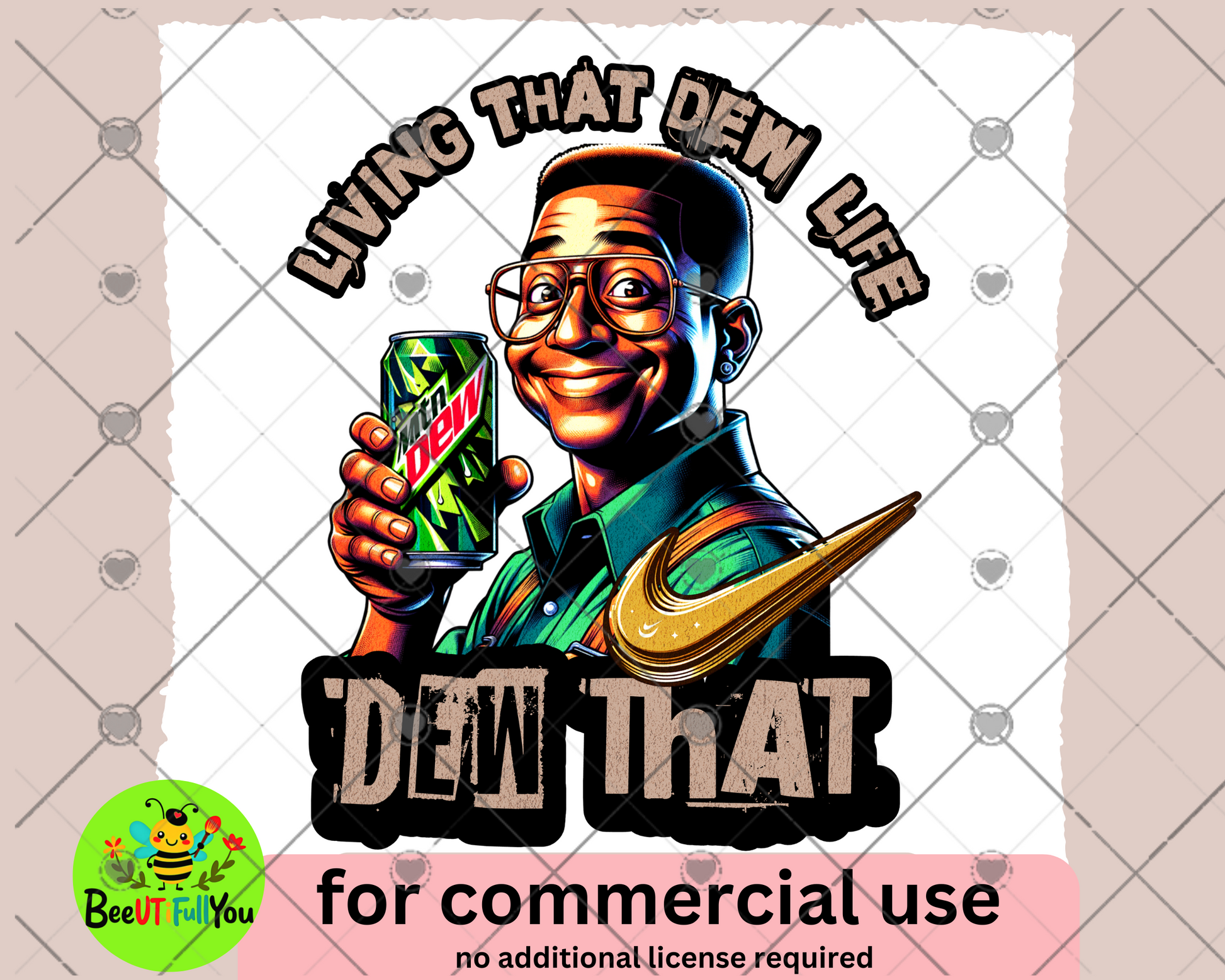 This vibrant PNG image features a stylized illustration of a person holding a can of Mountain Dew. The person is depicted in a cool, trendy manner, wearing glasses and a green shirt, with a prominent Nike swoosh on the shoulder. The text "LIVING THAT DEW LIFE" arches above the person's head, while "DEW THAT" is boldly displayed below. The image is marked for commercial use with no additional license required, as indicated by the BeeUTifulYou logo in the bottom left corner. This is a digital download; no physical item will be shipped. The digital download should not be shared, copied, or altered in any way. It should not be resold as it is the property of BeeUTifulYou.