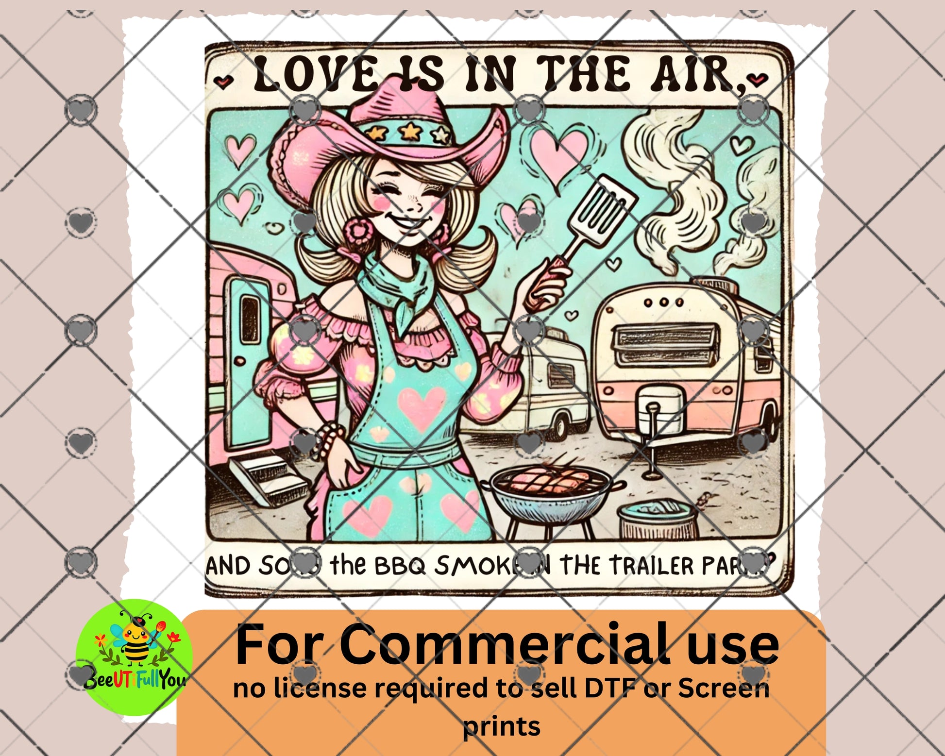 Turn up the heat this Valentine’s Day with this "Love is in the Air, and so is the BBQ Smoke in the Trailer Park" PNG Design! Perfect for those who love a touch of humor with their romantic vibes, this design showcases a fun-loving BBQ queen in a trailer park setting.