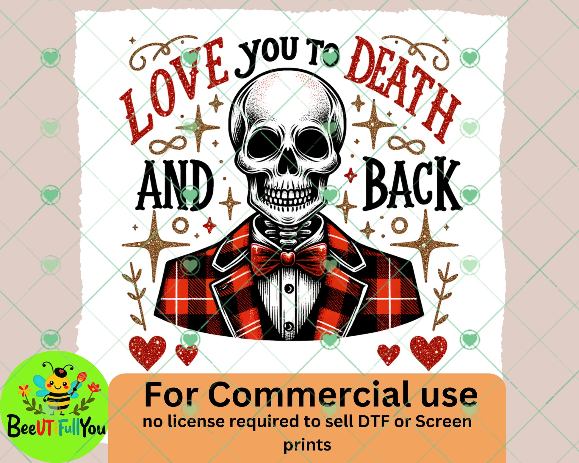 Celebrate timeless love with a twist! This "Love You to Death and Back" PNG design features a dapper skeleton in a red plaid suit, surrounded by sparkling hearts and whimsical accents. Perfect for DTF or screen printing, this high-quality design adds a bold, gothic-romantic vibe to your apparel or merchandise.