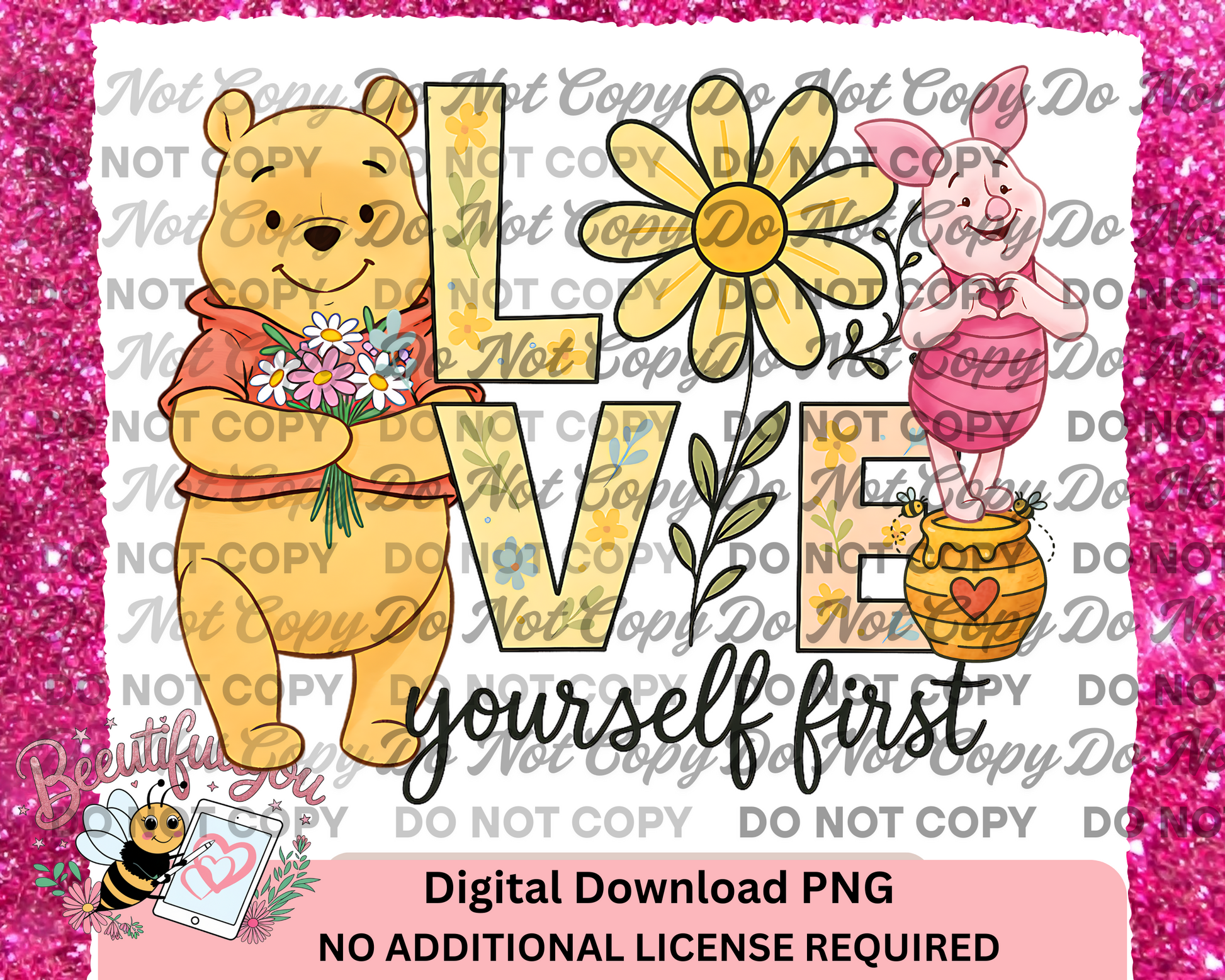 Love Yourself First PNG – Pooh and Piglet Digital Download with Floral Lettering