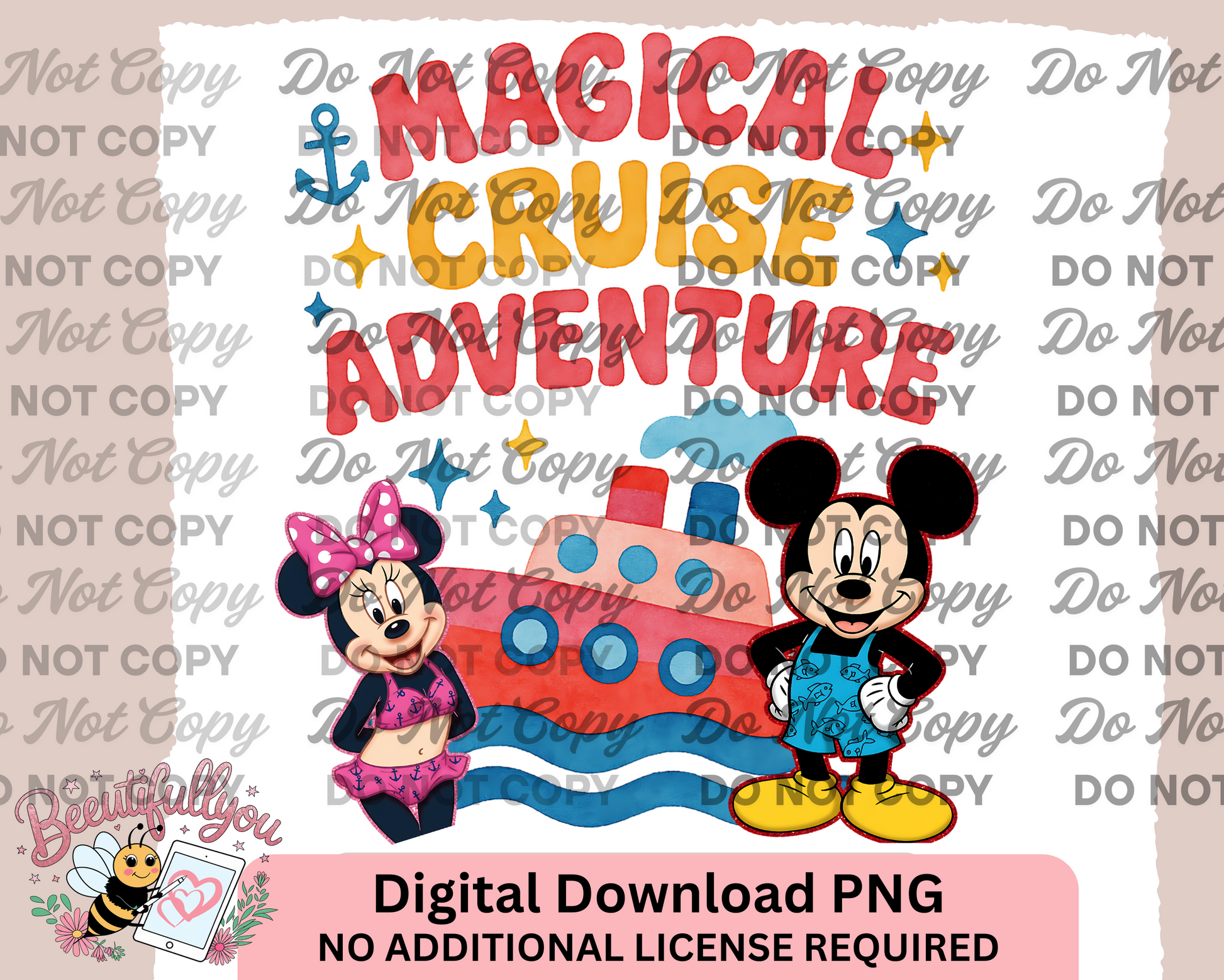 Sail into fun with this bold and bubbly “Magical Cruise Adventure” PNG! Featuring a hand-drawn Disney-inspired cruise ship, Mickey and Minnie in their vacation best, and retro cruise lettering with stars, anchors, and sparkles – this design is perfect for shirts, cruise tees, and vacay vibes.