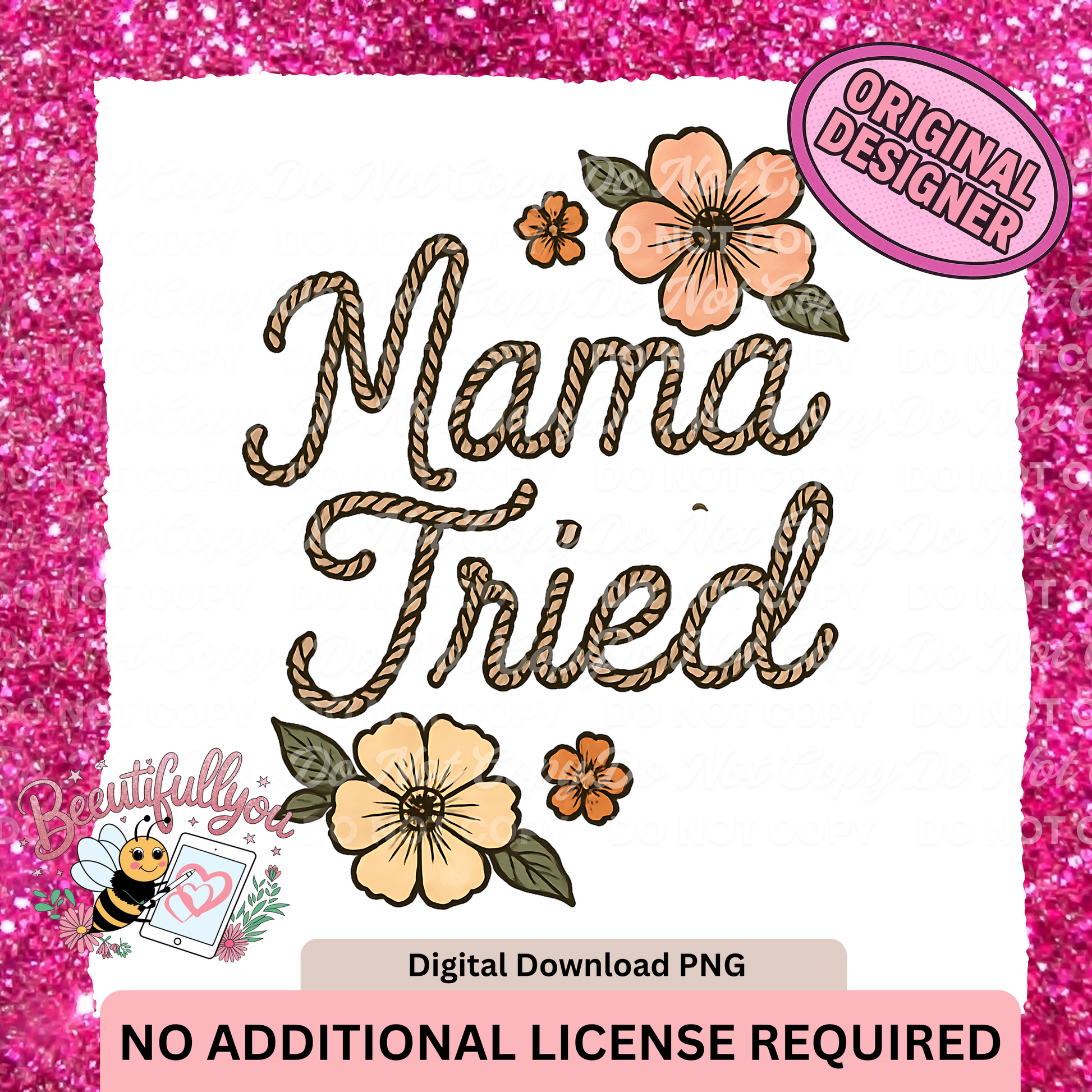 Mama Tried | Western Rope Lettering with Floral Accents PNG Design | No Additional License Required