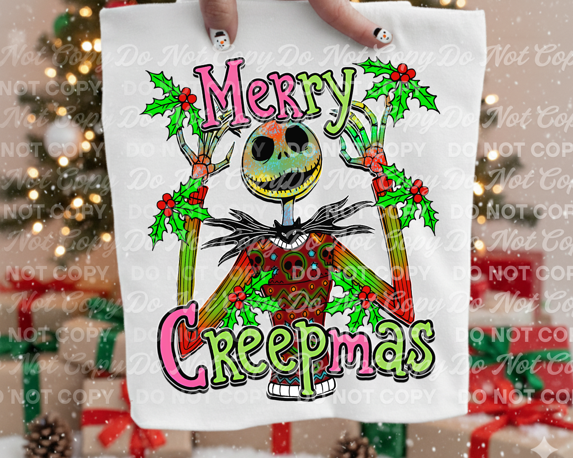 This festive design features everyone’s favorite Pumpkin King for Christmas — decorated in soft holiday colors and festive holly. The festive text “Merry Creepmas” is styled in a softer red and green to allow the bright colors of the design to shine through, making it perfect for holiday apparel, stockings, mugs, tote bags, and more.