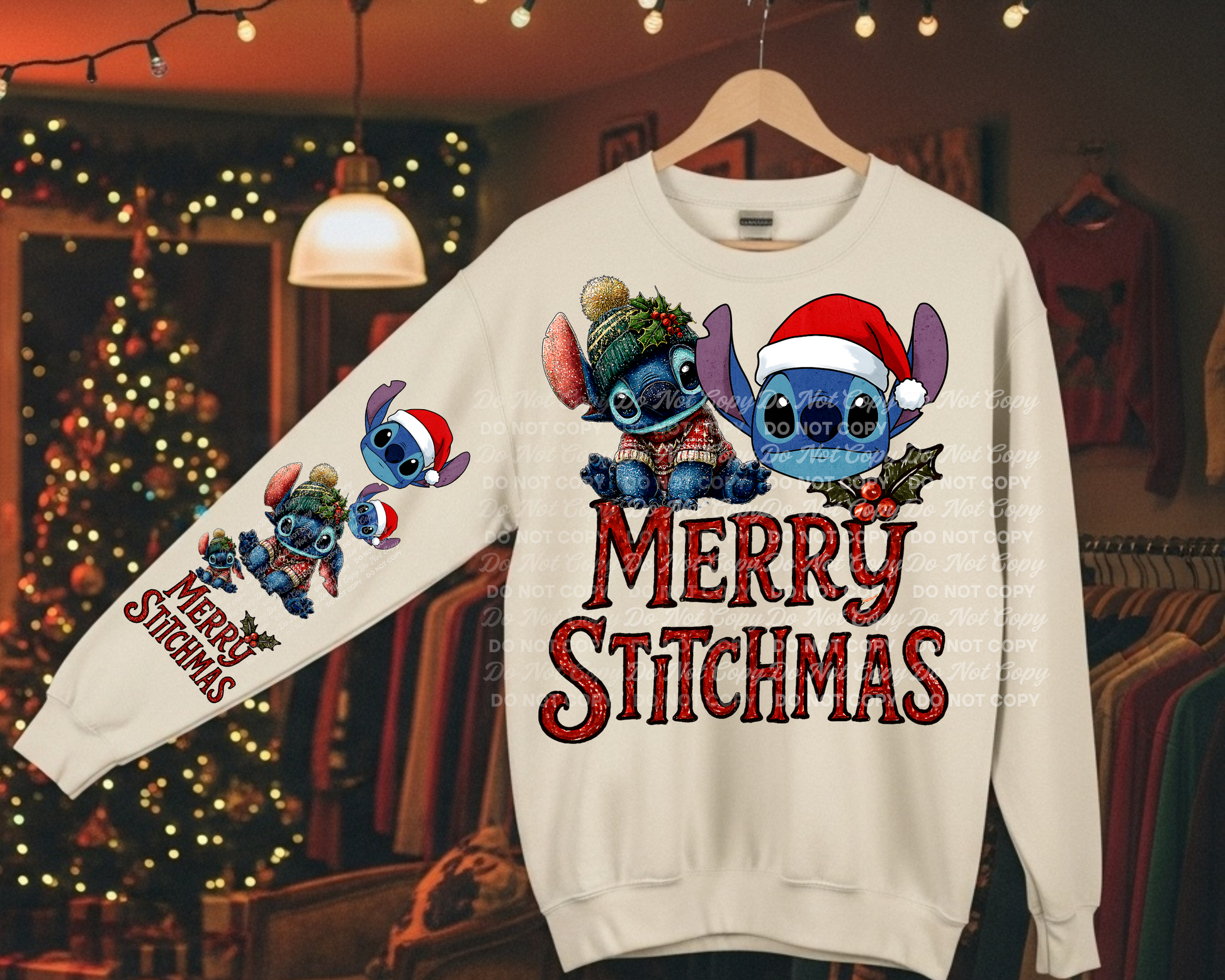This festive design features everyone’s favorite blue alien dressed for Christmas — one in a cozy sweater and beanie, and the other wearing a Santa hat. The playful text “Merry Stitchmas” is styled in bold, glittery holiday lettering with holly accents, making it perfect for holiday apparel, stockings, mugs, tote bags, and more.