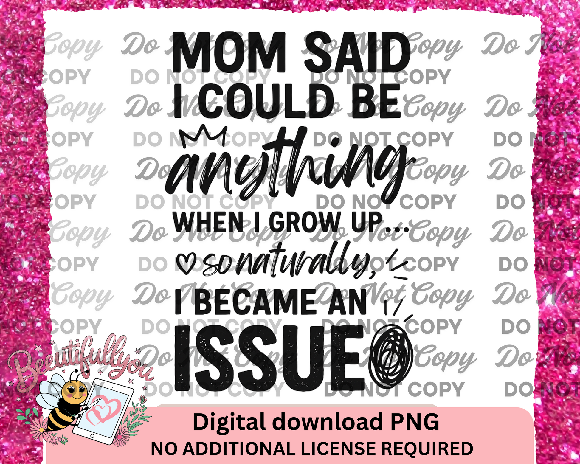 Mom Said I Could Be Anything So I Became an Issue, Digital Design, Black Handwritten Quote Clipart, Transparent Background