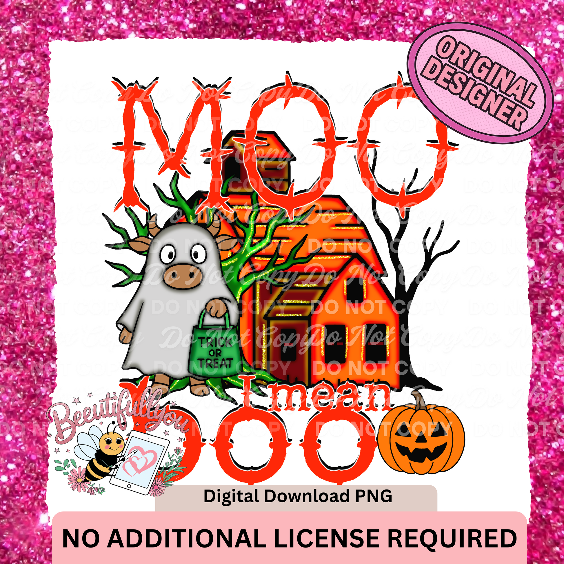 This adorable Halloween PNG features a trick-or-treatin’ cow in a ghost sheet with the punny phrase “Moo… I Mean Boo” in creepy red letters. Perfect for farmhouse humor fans who love Halloween with a side of moo-dy charm.