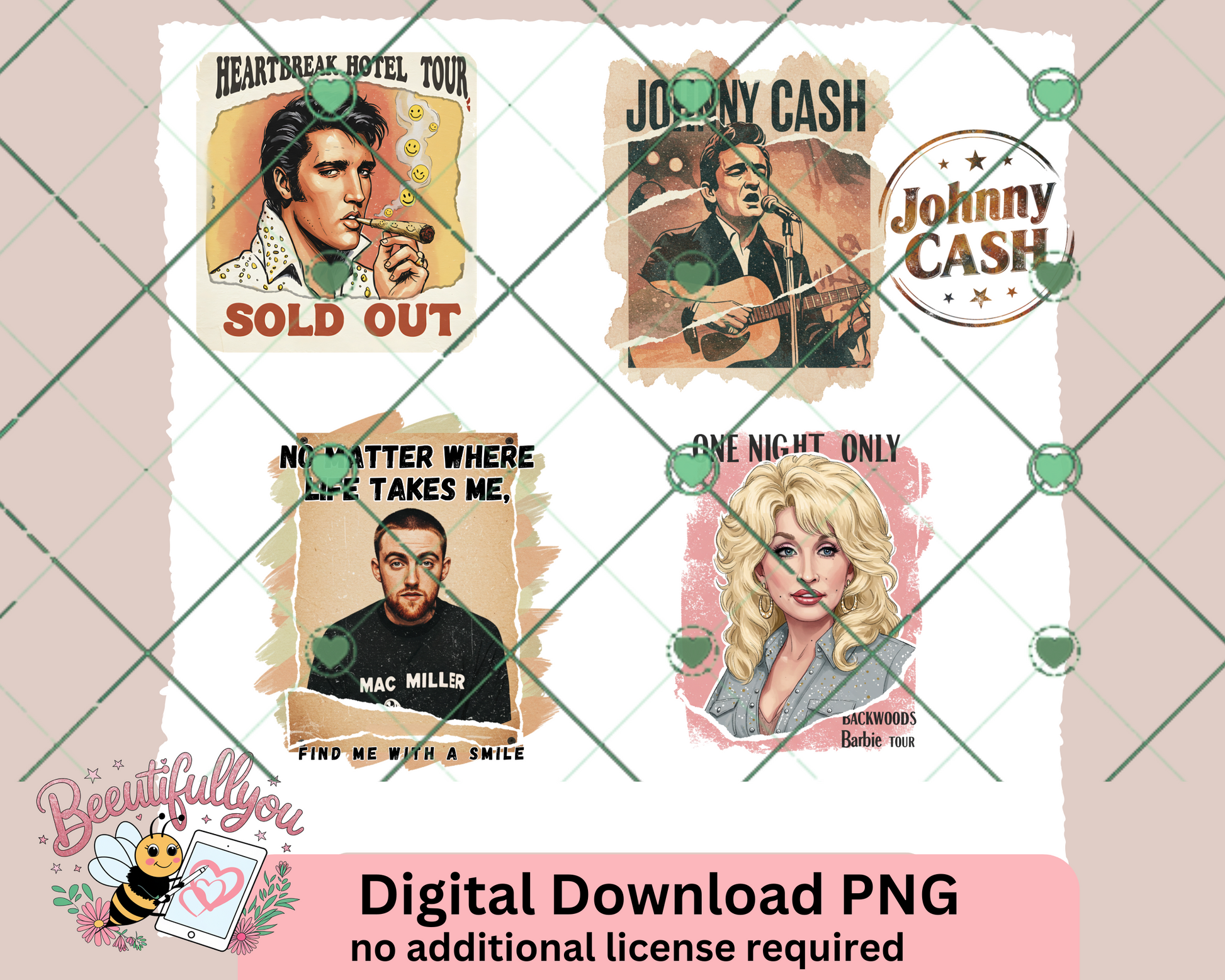 Celebrate music legends with this exclusive 4-design bundle featuring Elvis Presley, Johnny Cash, Dolly Parton, and Mac Miller! Whether you're a fan of country, rock, or hip-hop, this set has something iconic for every music lover.