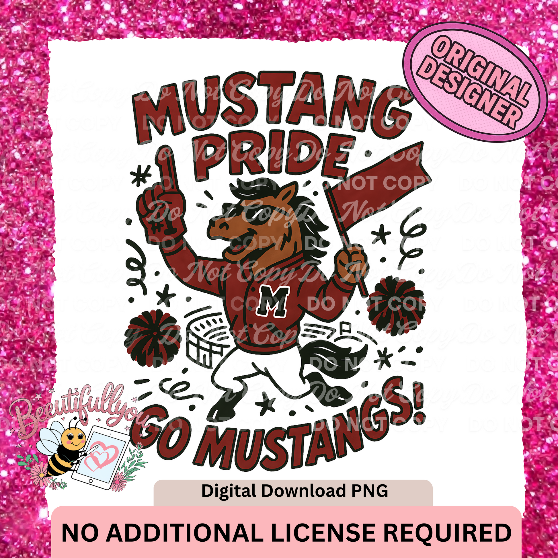 Show your school spirit loud and proud with this fierce and fun hand-drawn mustang mascot design! Featuring bold red and black confetti, stadium doodles, and a varsity-style vibe — it’s perfect for making standout game day gear.