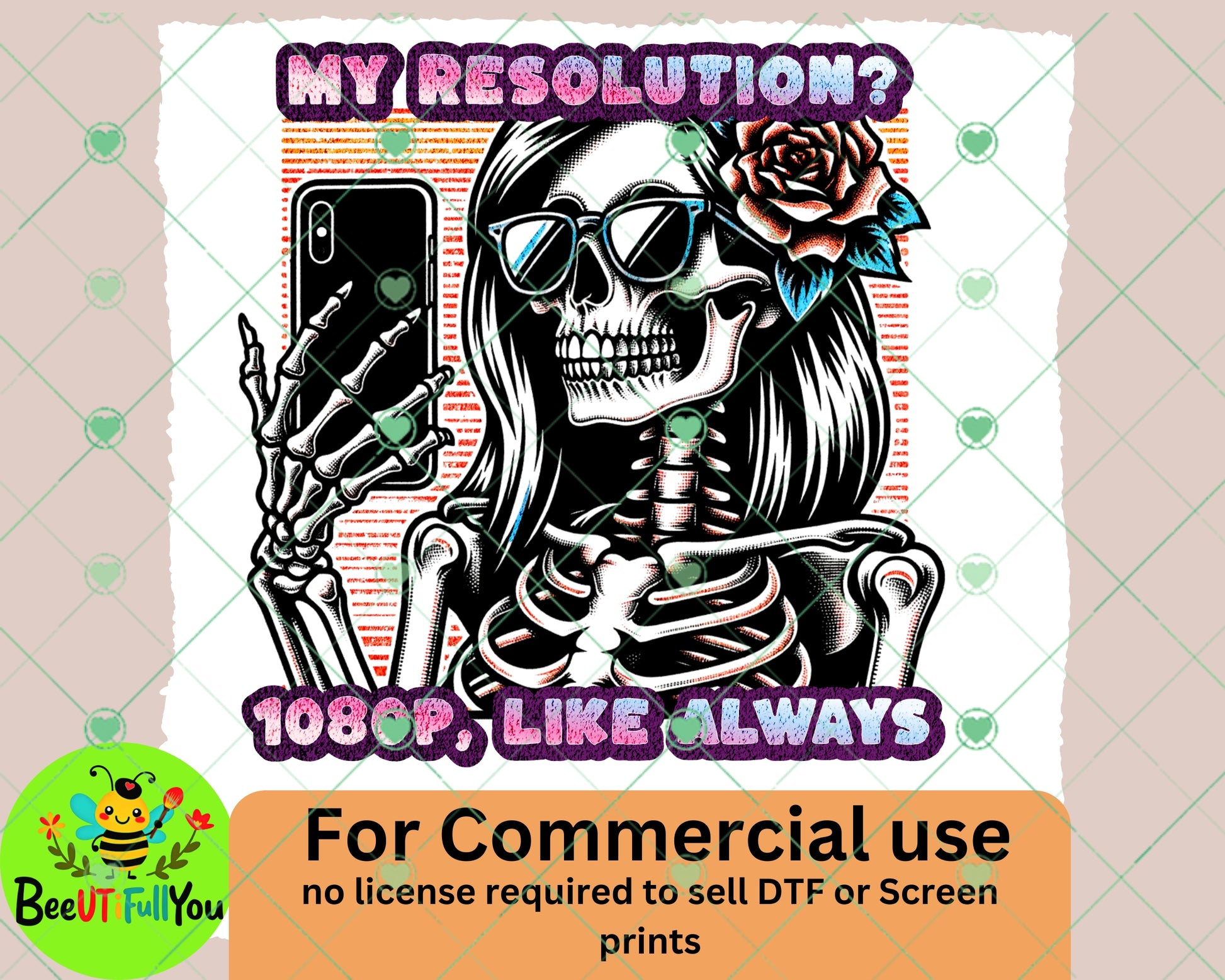 "My Resolution? 1080p, Like Always" Funny Skeleton New Year's PNG Design for DTF and Screen Printing - Commercial Use