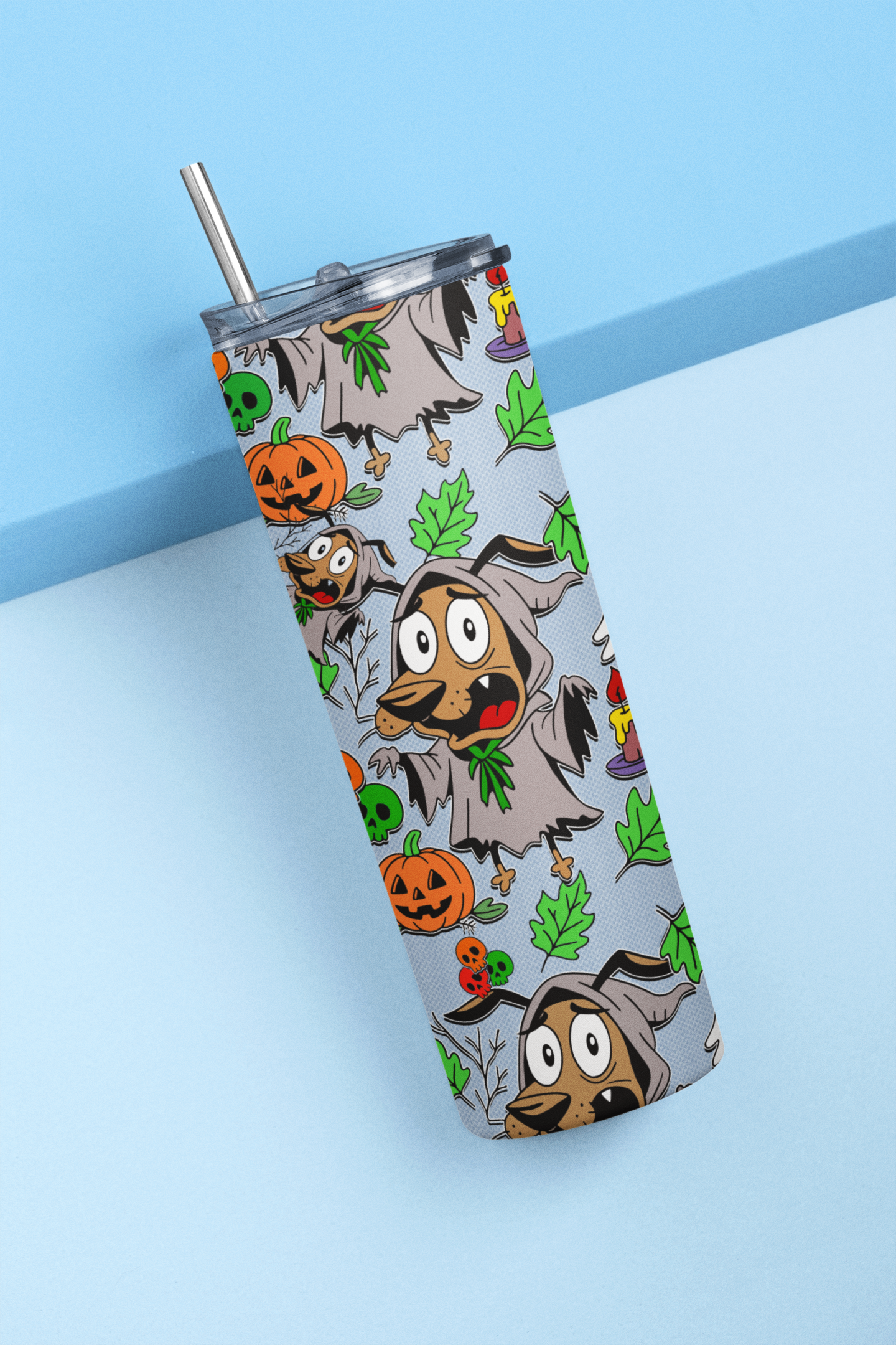 Loaded with spooky details: pumpkins, floating ghosts, skulls, and eerie leaves
