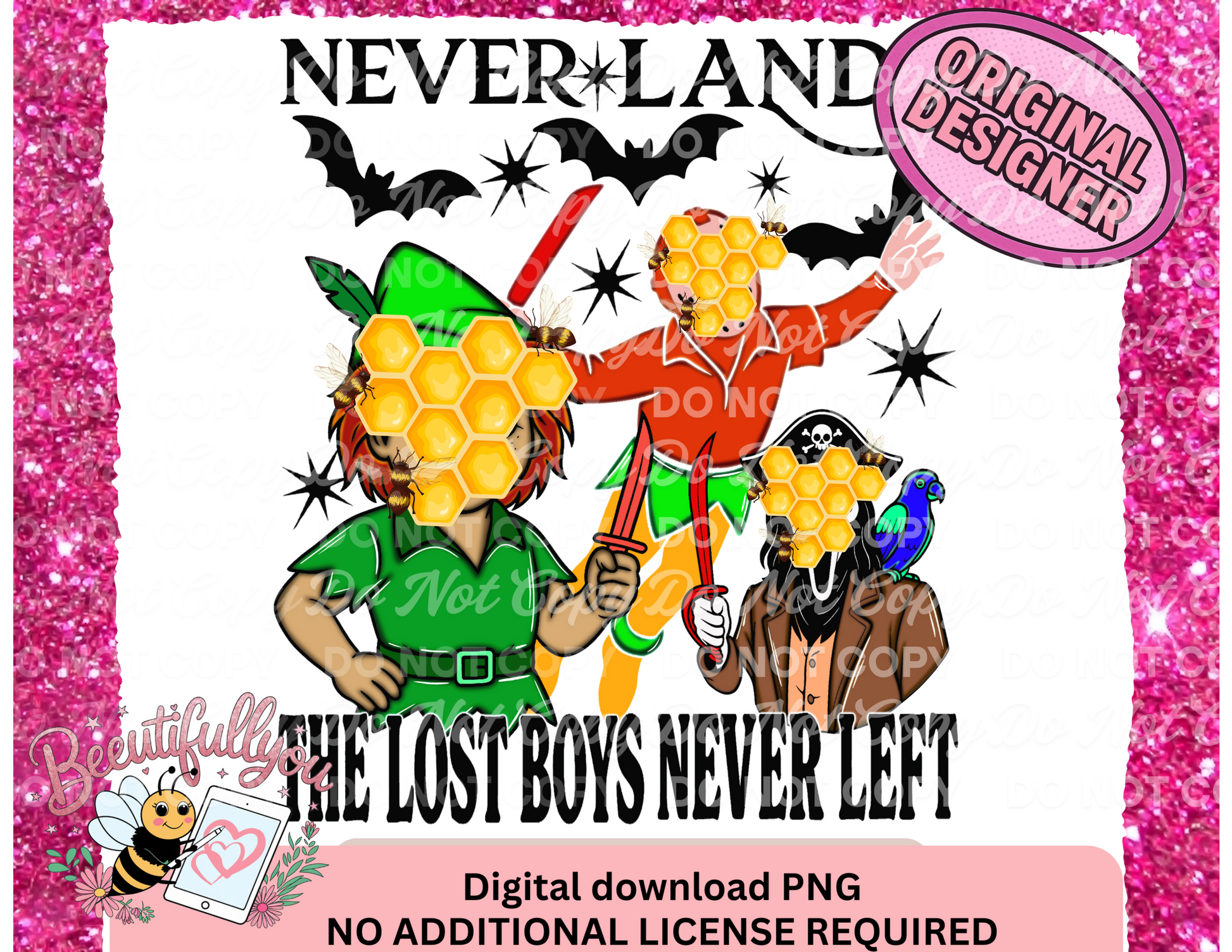 What if Neverland got way darker? This twisted and hilarious PNG features a mashup of classic horror villains reimagined as the Lost Boys—complete with Peter Pan vibes, a pirate Scream, and bats flying over the bold text: