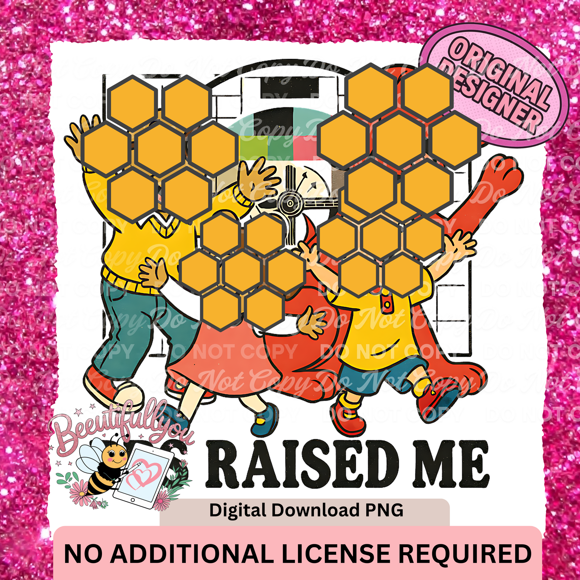 Take a trip down memory lane with this “PBS Raised Me” PNG by BeeUTiFullYou! Featuring a group of beloved, cartoon-inspired childhood characters posed in front of a retro test pattern screen, this design is perfect for 90s/2000s babies, teachers, parents, and anyone who grew up on wholesome TV magic.