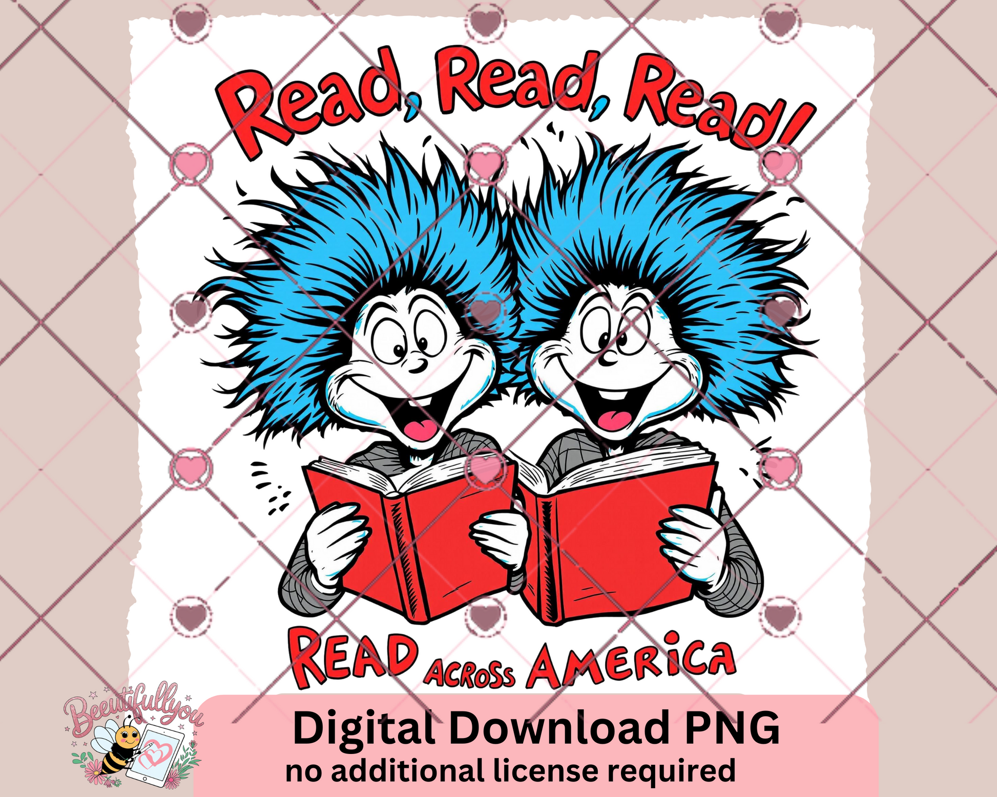 Make reading exciting with this colorful and engaging "Read, Read, Read!" digital design! Inspired by classic characters and filled with vibrant energy, this high-quality PNG is perfect for celebrating Read Across America, creating custom t-shirts, mugs, posters, or classroom decorations.