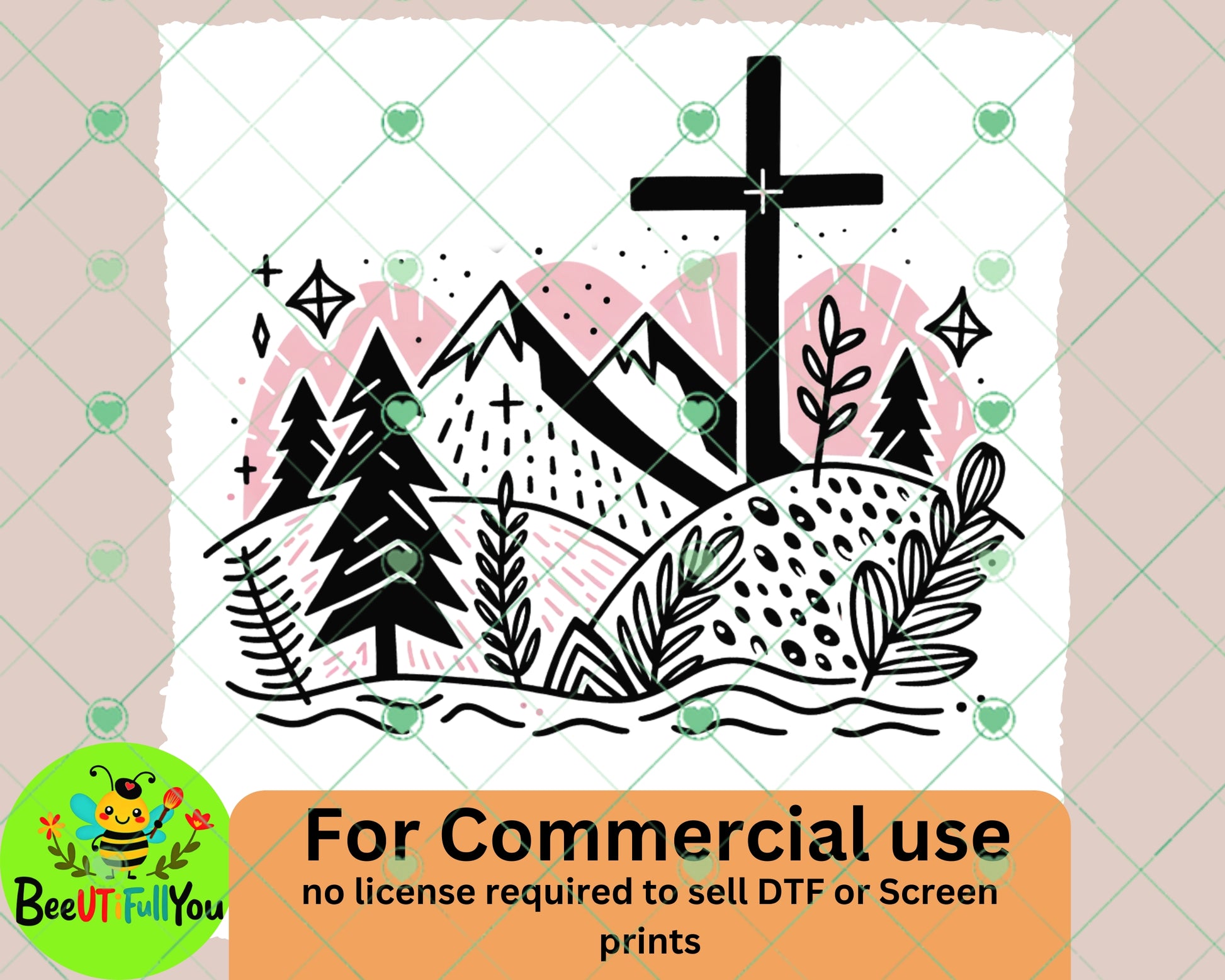 🏔️ Rustic Cross and Mountain Scene – Celebrate your faith with this peaceful and nature-inspired design! Featuring a bold cross surrounded by mountains, trees, and greenery, this minimalist yet striking artwork captures the beauty of God's creation. Perfect for spiritual and rustic-themed designs.