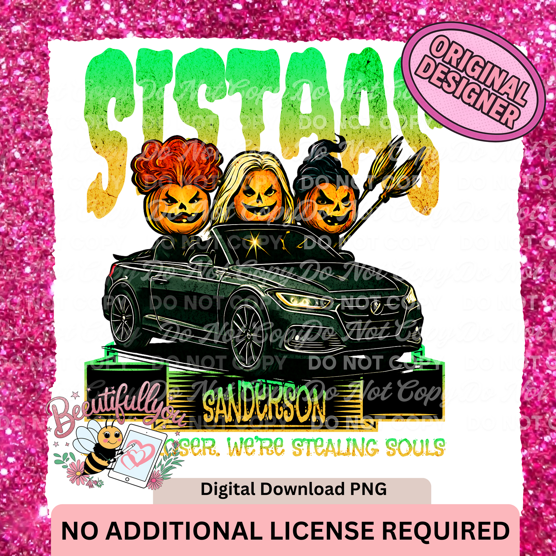 Cruise into Halloween chaos with this hilarious Sanderson Sisters parody design—featuring the iconic trio as pumpkin-headed witches in a drop-top ride! With bold "SISTAAS" lettering and the line "Yassir, we’re stealing souls," this PNG brings all the spooky sass and squad energy you need for tees, totes, and more.