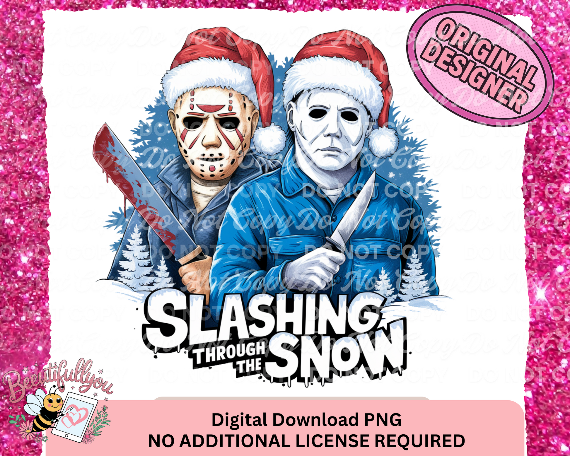 Add a terrifying twist to your holiday merch with this Slashing Through the Snow PNG! Featuring Jason Voorhees and Michael Myers in Santa hats, holding bloody knives, with a snowy forest backdrop, this design is perfect for horror movie fans who love dark humor during Christmas.