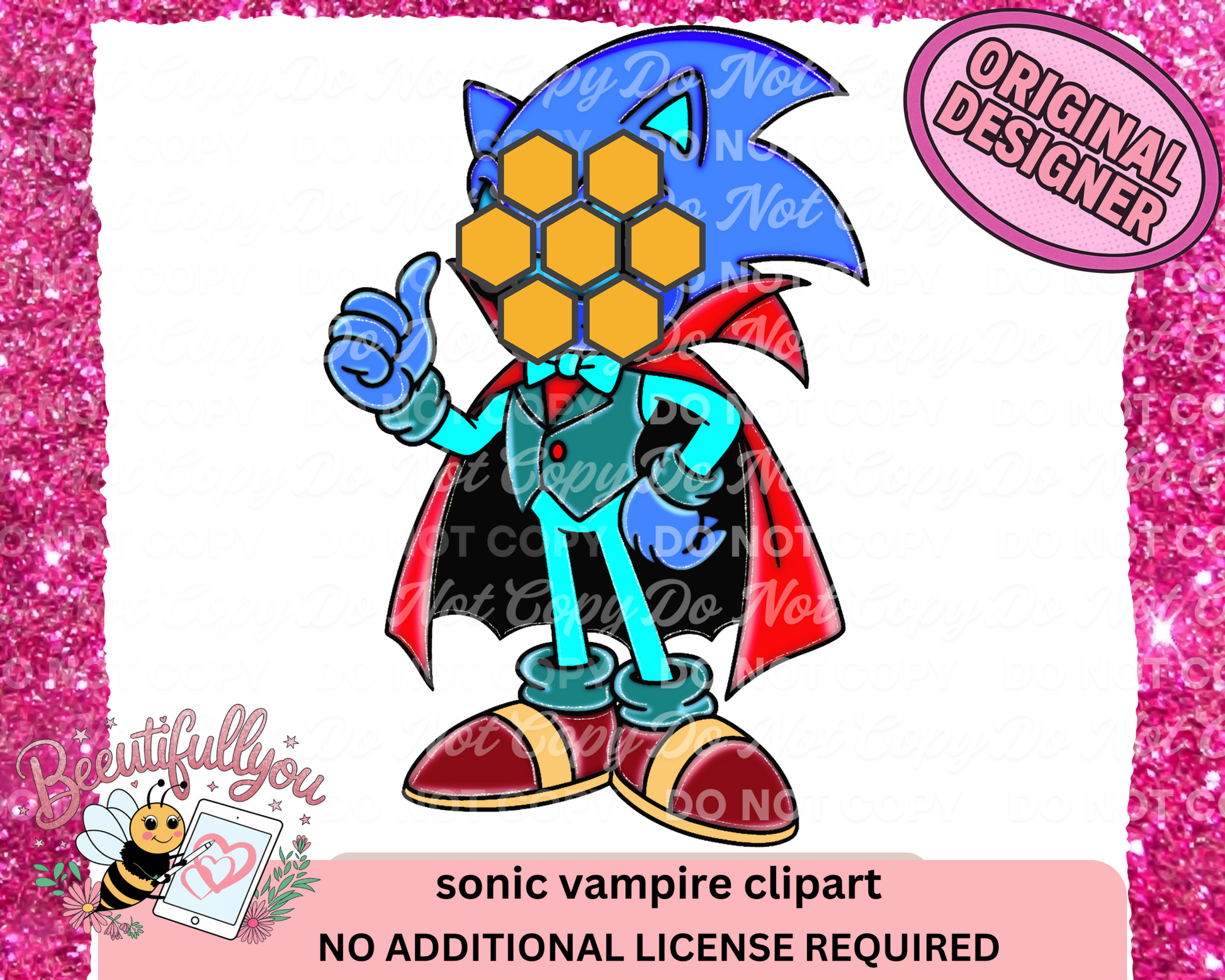 This spooky-cute clipart PNG features a vampire-dressed Sonic-inspired character, perfect for Halloween-themed designs! With his cape, vest, and fangs, he’s ready to race into your creative projects. Use it in spooky shirt layouts, party invites, or trick-or-treat bag designs.