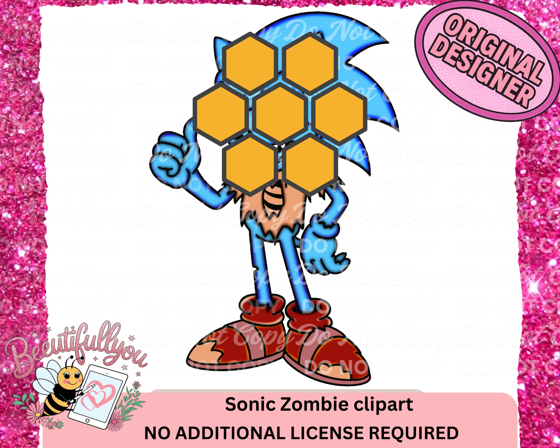 This creepy-cool clipart PNG features a Sonic-inspired zombie character, complete with torn clothes, jagged teeth, and a wild undead stare. Perfect for spooky DIY designs, Halloween graphics, or horror-themed party merch!
