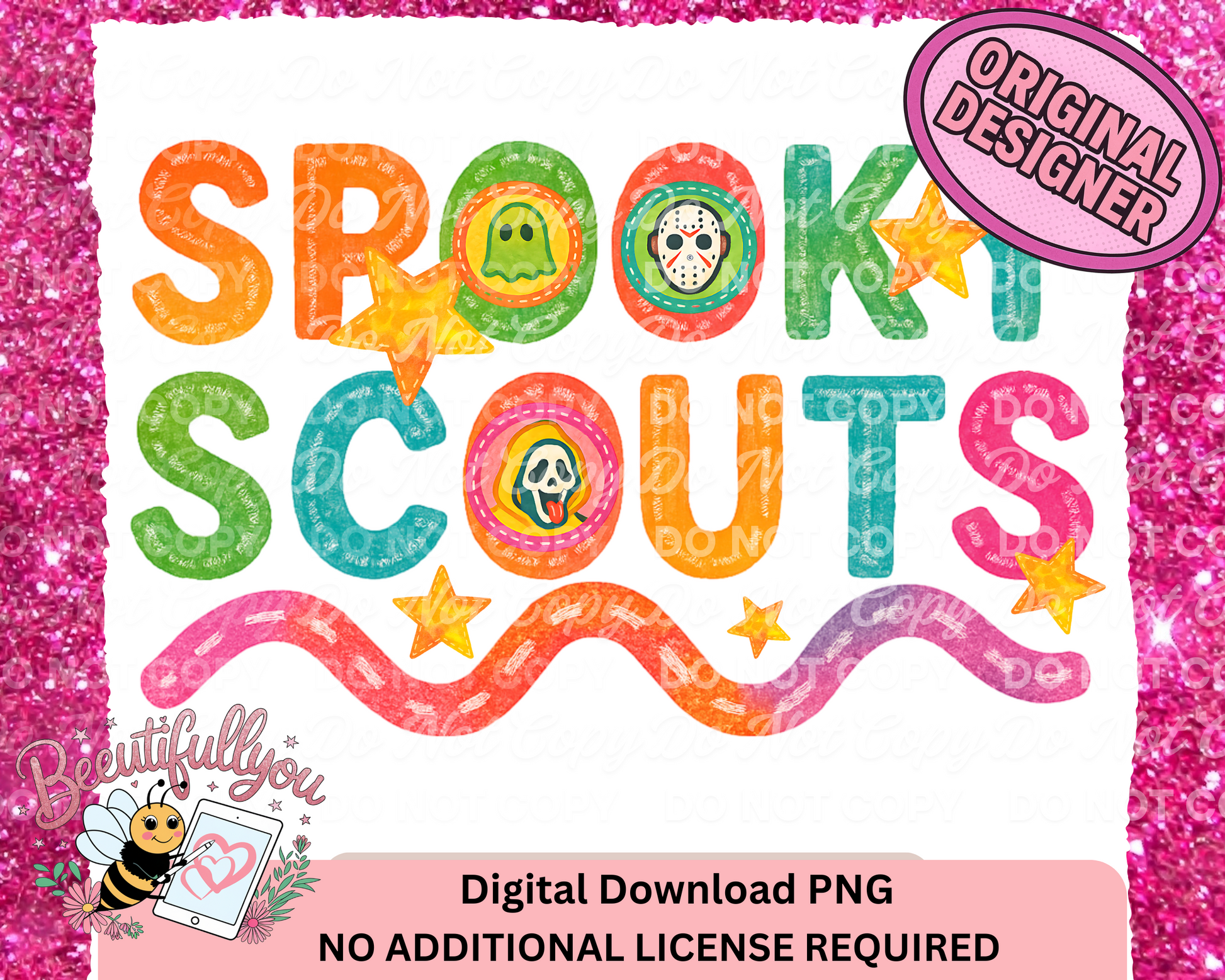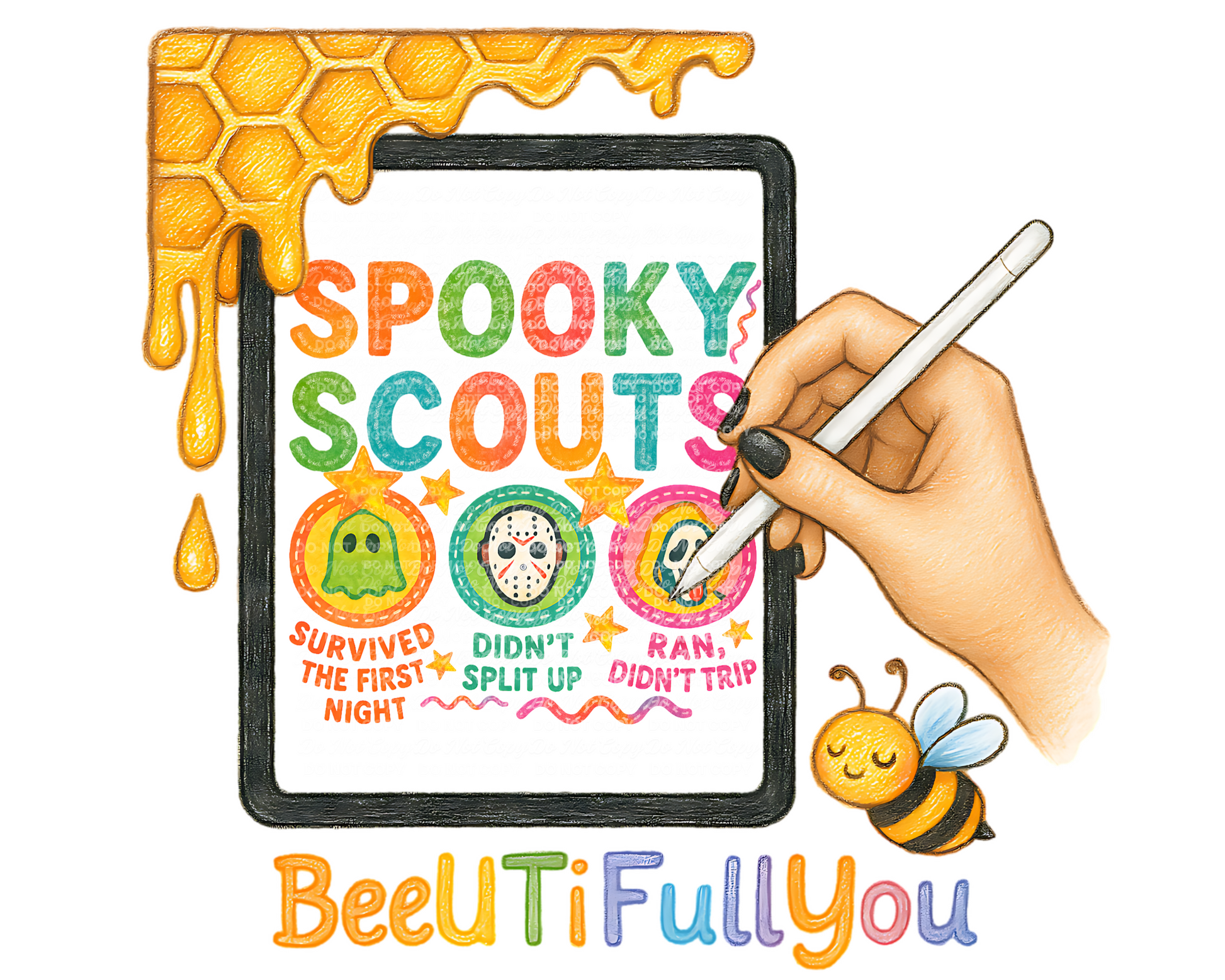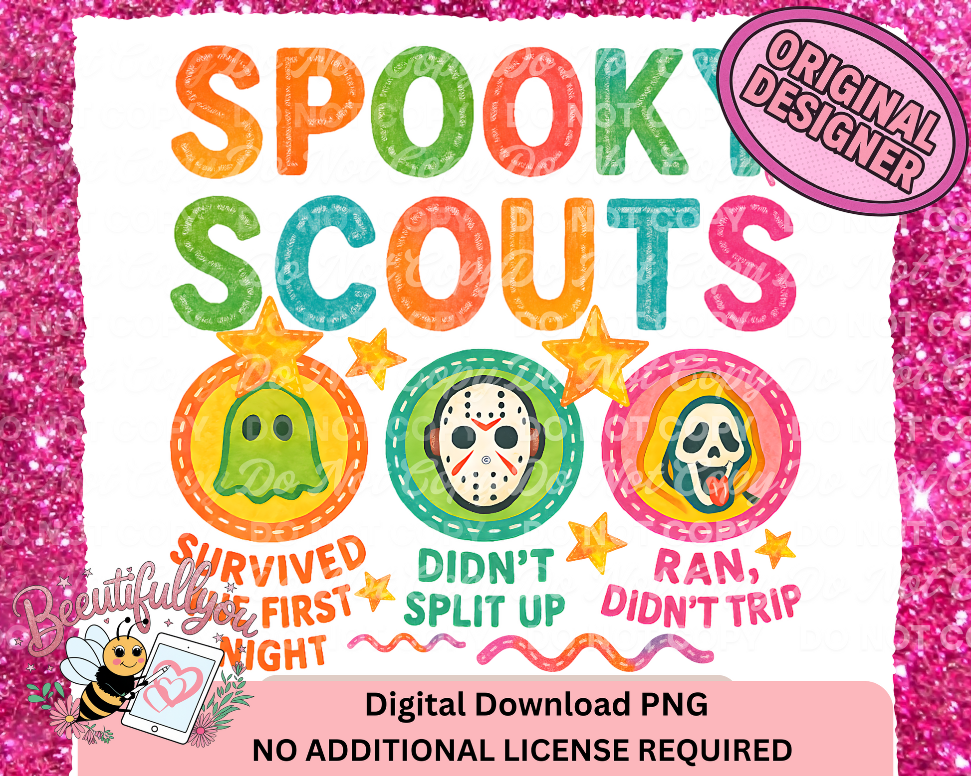 This playful “Spooky Scouts” PNG features bold, colorful letters filled with Halloween flair—Ghostface, Jason, and Ghost emoji badges all included! Perfect for Halloween-themed camp shirts, spooky clubs, and scout-style groups with a spooky twist.