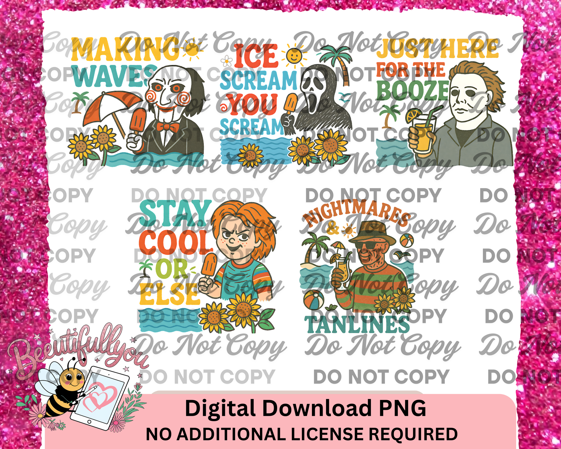 Get spooky in the sunshine with this hilarious Spooky Summer PNG bundle featuring horror icons like Chucky, Ghostface, Freddy, and more—enjoying summer like the rest of us! With quotes like "Nightmares & Tanlines" and "Stay Cool or Else," these high-res PNGs are perfect for shirts, tumblers, party invites, and beach season merch.