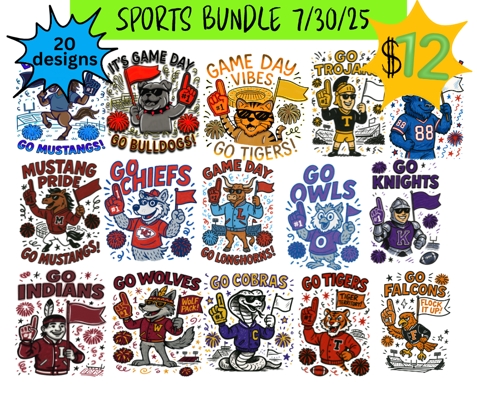 Get your game face on with this spirited 20-design sports bundle! Featuring hand-drawn mascots and bold, doodle-style artwork for Mustangs, Bulldogs, Tigers, Trojans, Chiefs, Owls, Falcons, and more — these designs are perfect for back-to-school, football season, or custom apparel for local teams.
