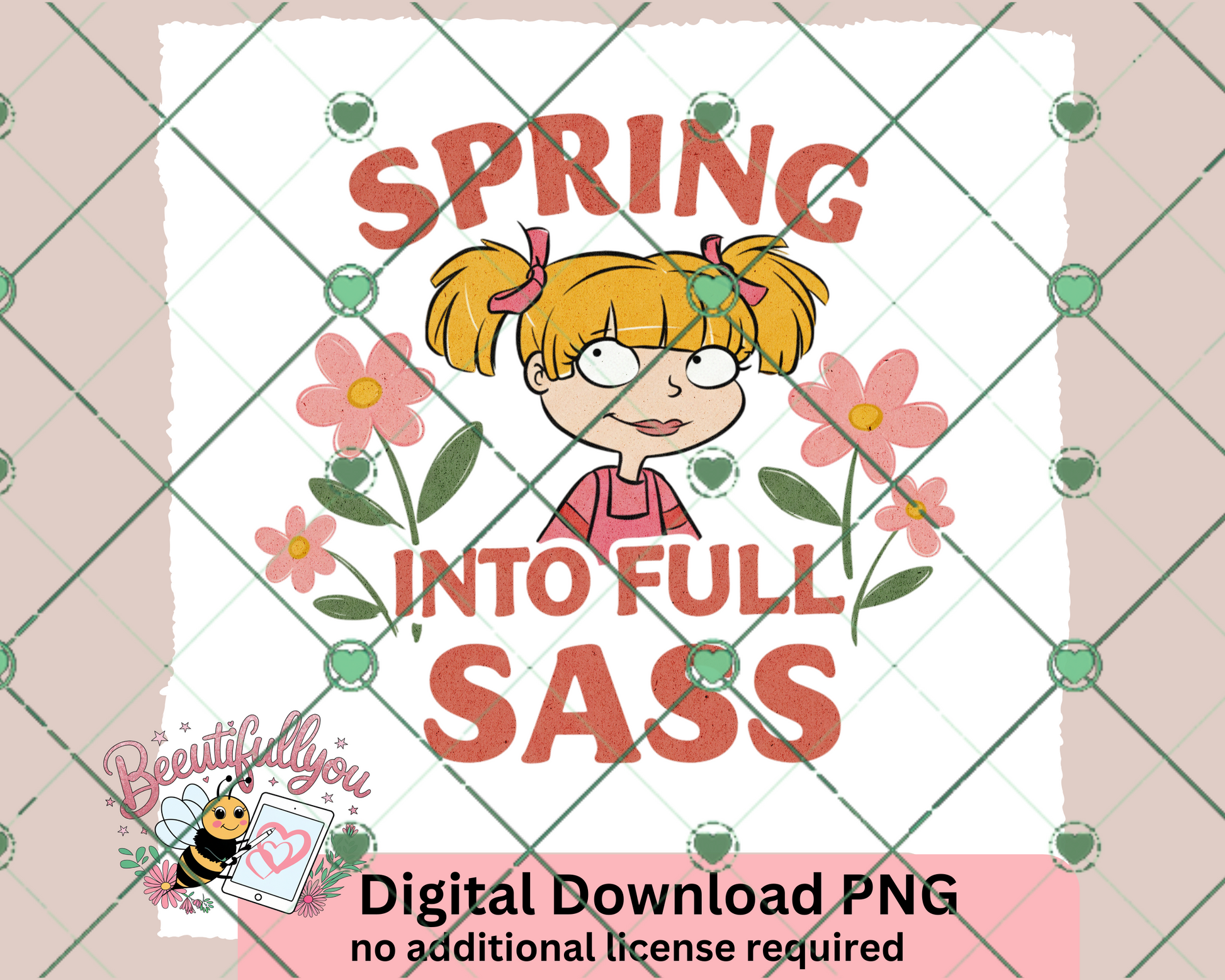 - A sassy and playful design featuring a girl with attitude and the phrase "Spring into Full Sass," ideal for those who love humor in their seasonal fashion.