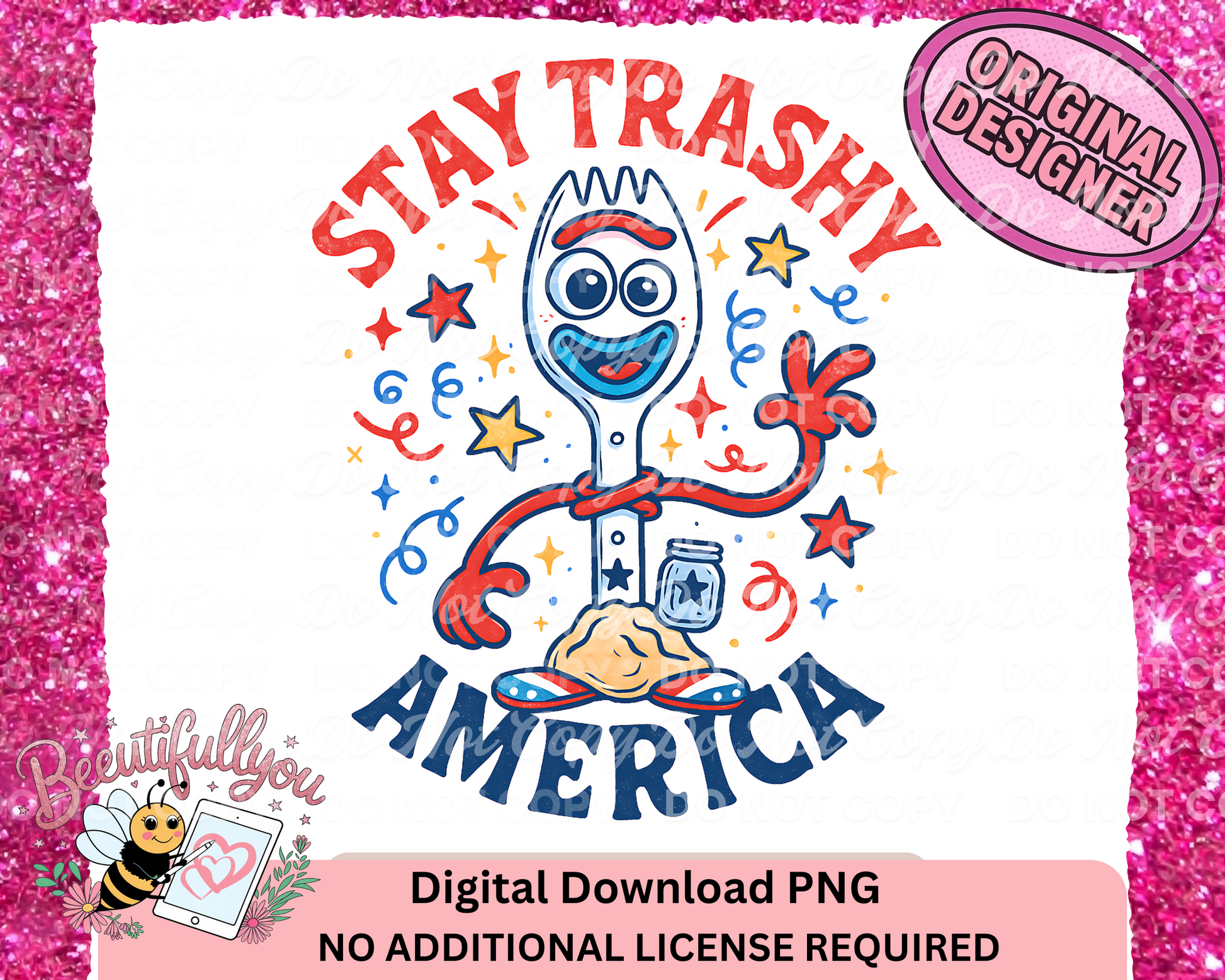Keep it quirky this Fourth of July with the hilarious “Stay Trashy America” PNG featuring a patriotic plastic spork character surrounded by stars, confetti, and a cheeky red, white, and blue vibe. Perfect for party shirts, tumblers, or decals that bring a little trash talk to your summer celebrations!