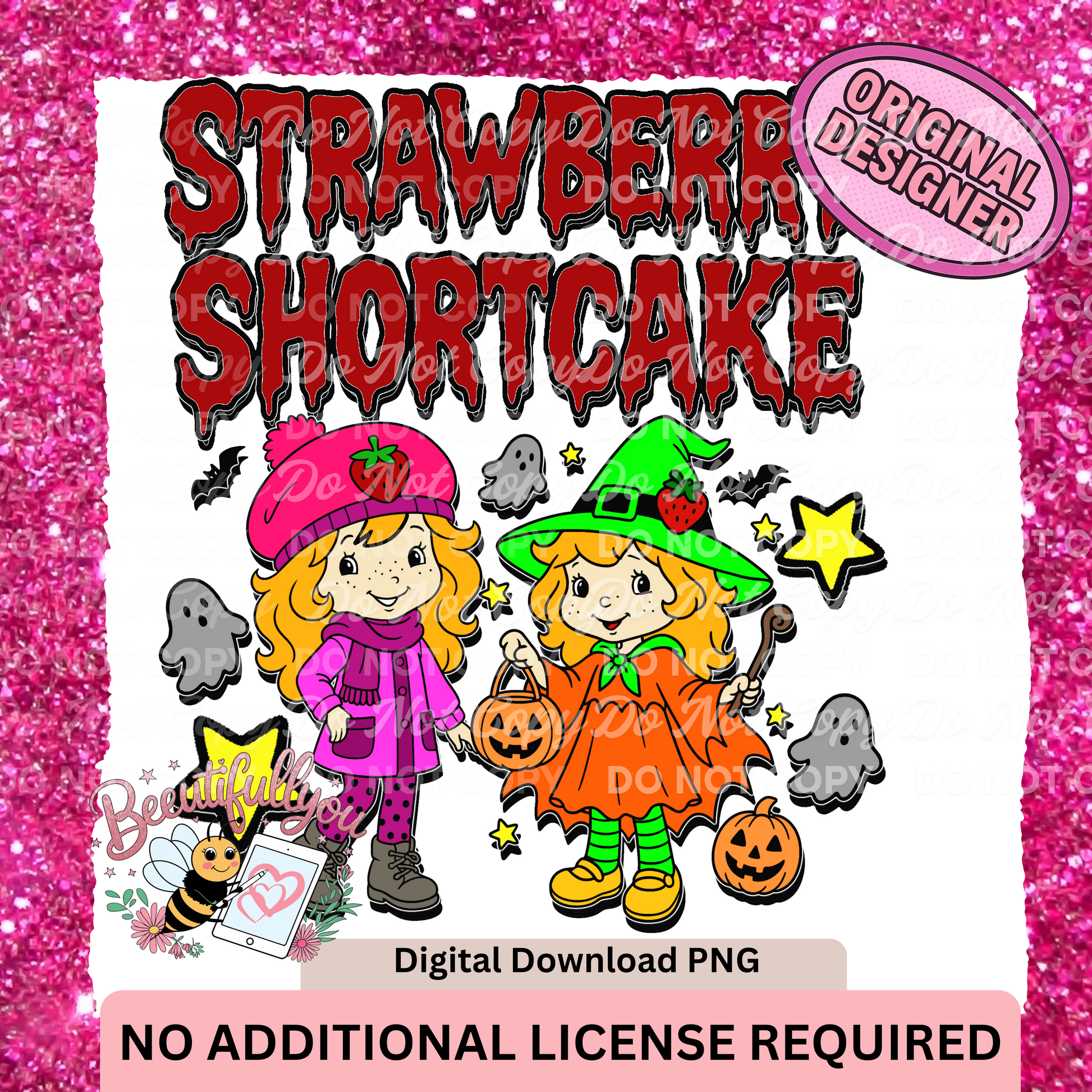 Your favorite berry sweet girl is back with a spooky twist! 🎃 This Strawberry Shortcake Halloween PNG design features two adorable girls in witchy Halloween outfits, surrounded by candy, ghosts, and stars — the perfect combo of cute and creepy!