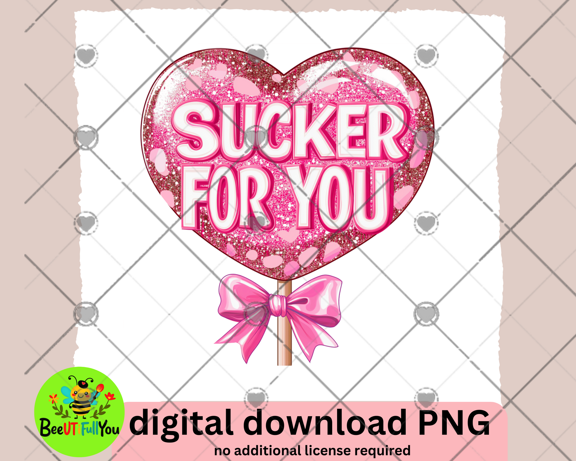 Celebrate love in the sweetest way with this adorable "Sucker for You" Valentine’s Day PNG design! Featuring a glittery heart-shaped lollipop wrapped with a pink bow, this high-quality digital file is perfect for creating festive t-shirts, mugs, cards, and more. Ideal for sublimation or DTF printing, this playful and charming design is sure to be a hit this Valentine’s season.