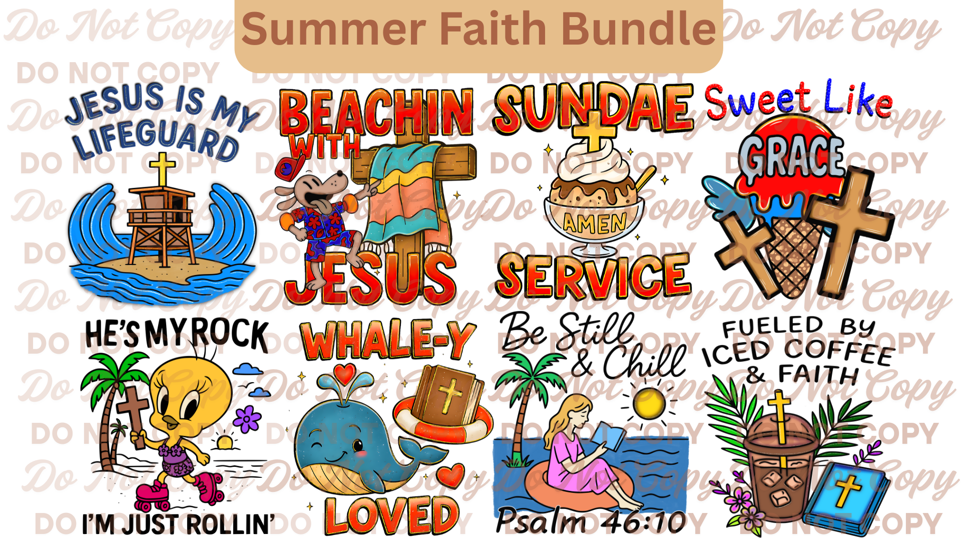 Celebrate sunshine and the Savior with this colorful and fun Summer Faith Bundle! Featuring 10 vibrant, hand-drawn faith-based summer designs, this pack is perfect for apparel, tumblers, totes, and more. Each design includes playful summer themes paired with powerful Christian messages – from “Jesus is my Lifeguard” to “Fueled by Iced Coffee & Faith.”