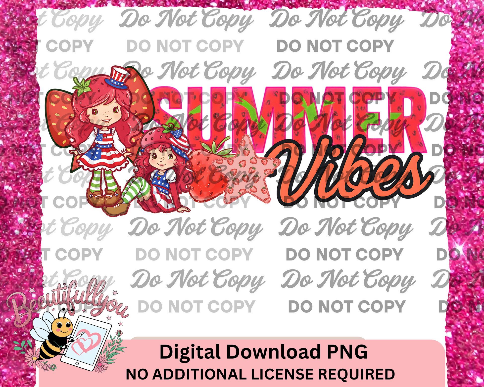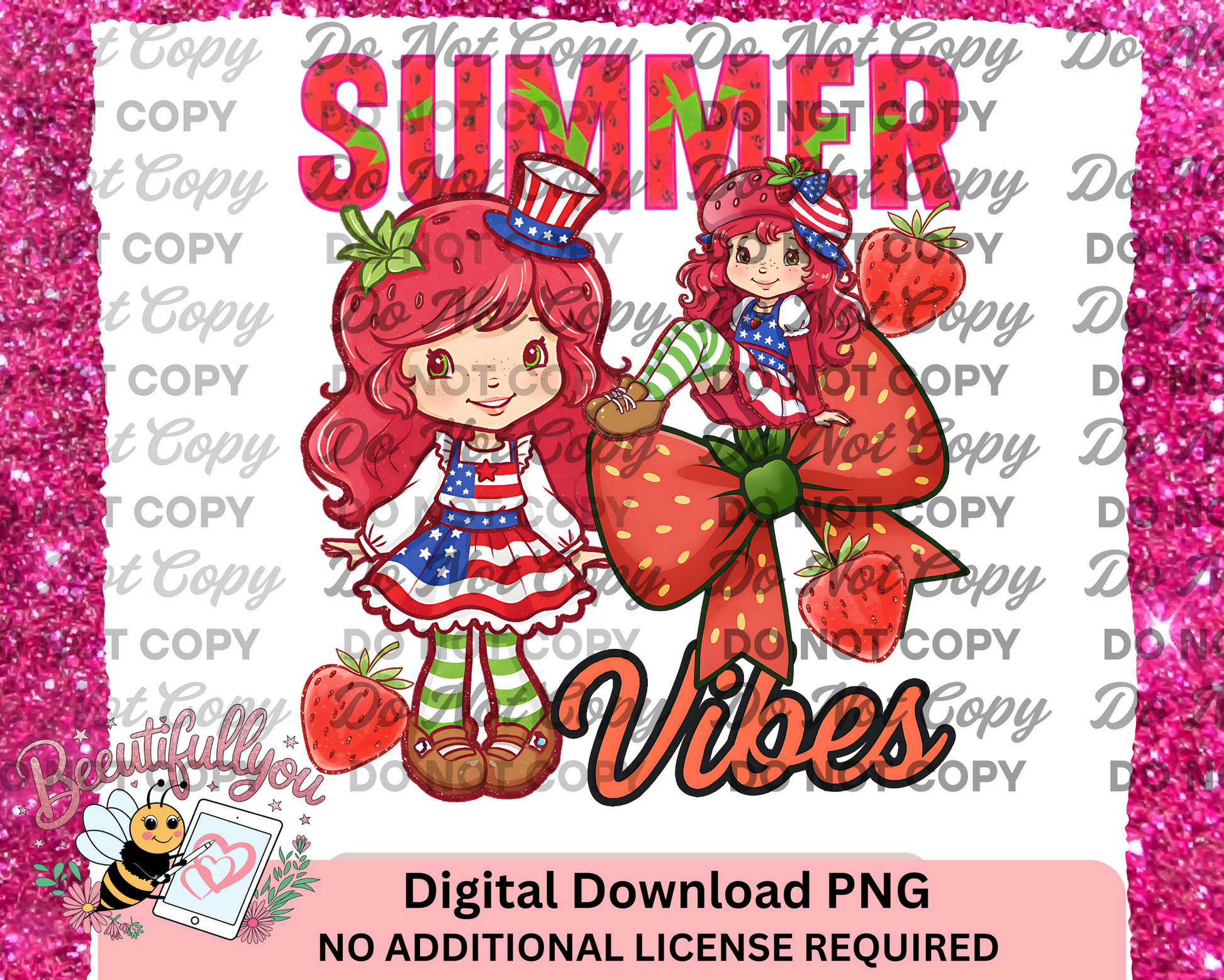 Sweeten up your summer projects with this Summer Vibes patriotic PNG featuring everyone's favorite redhead dressed in stars, stripes, and pure berry cuteness! With bold retro fonts, juicy strawberries, and two adorable characters in 4th of July outfits, this design is perfect for tees, bags, party invites, and more.