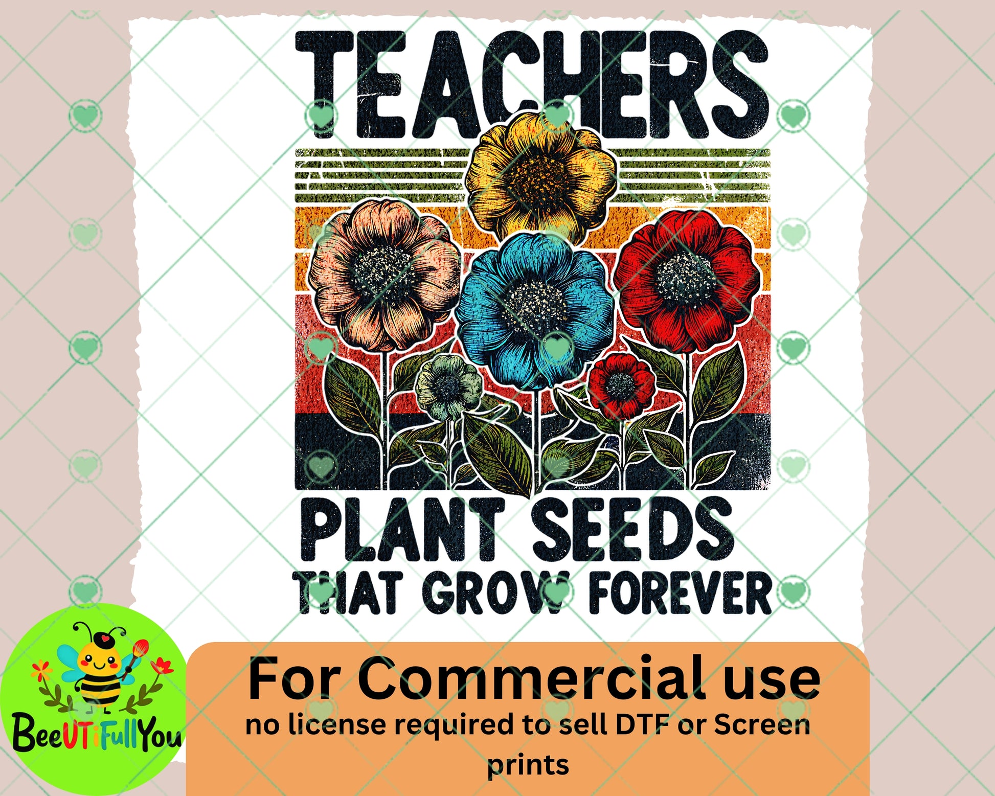 "Teachers Plant Seeds That Grow Forever" Retro Floral PNG Design for DTF and Screen Printing - Commercial Use Approved
