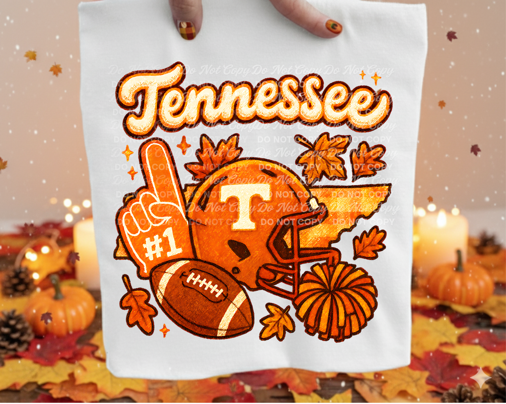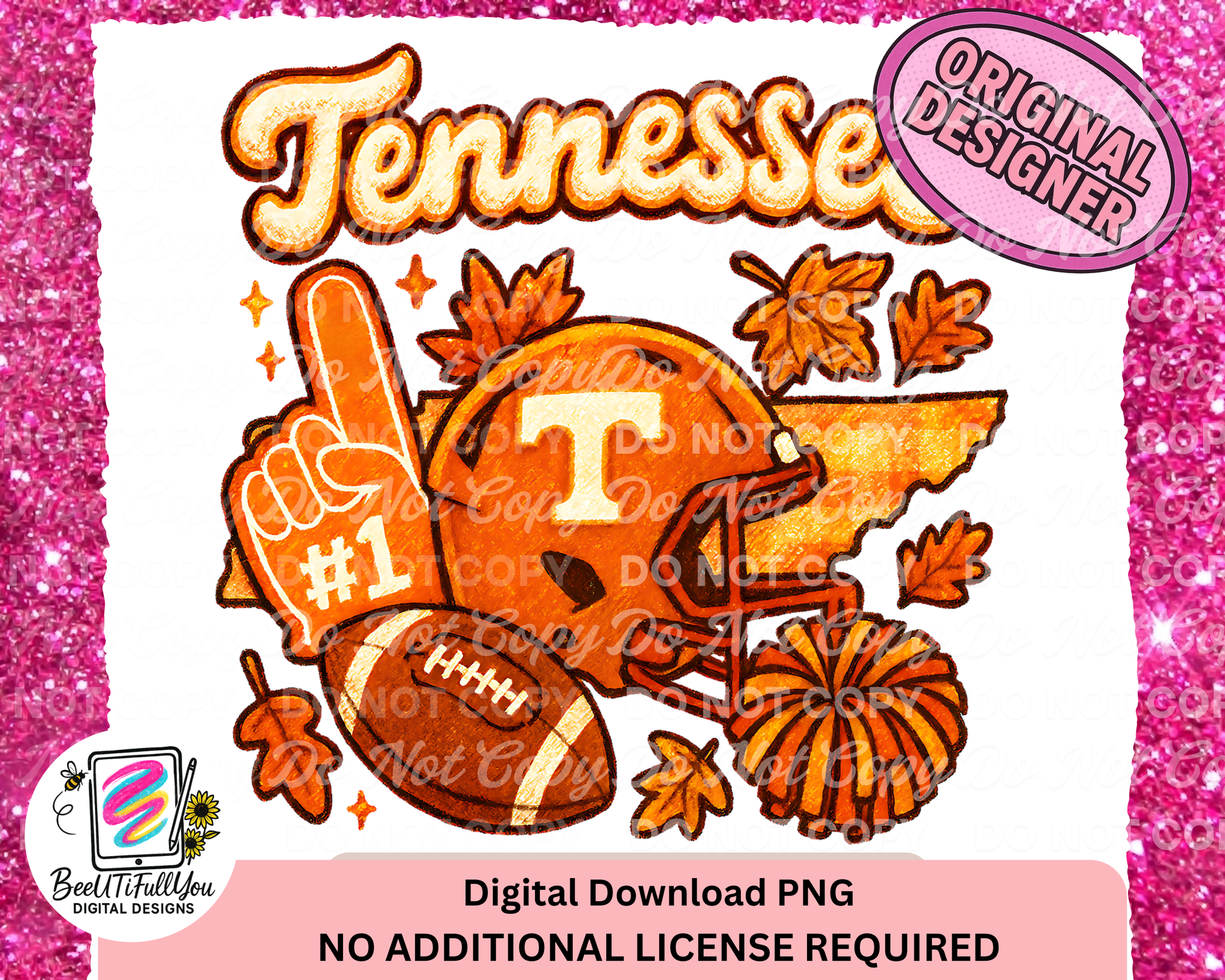 This finished PNG design features a detailed Vols football helmet, #1 foam finger, and autumn leaves, layered over the state outline of Tennessee with glowing, warm fall tones. The rich orange and gold textures paired with bold marker outlines and glittery shading give it that signature BeeUTiFullYou touch β perfect for fall apparel, football shirts, or spirit wear!