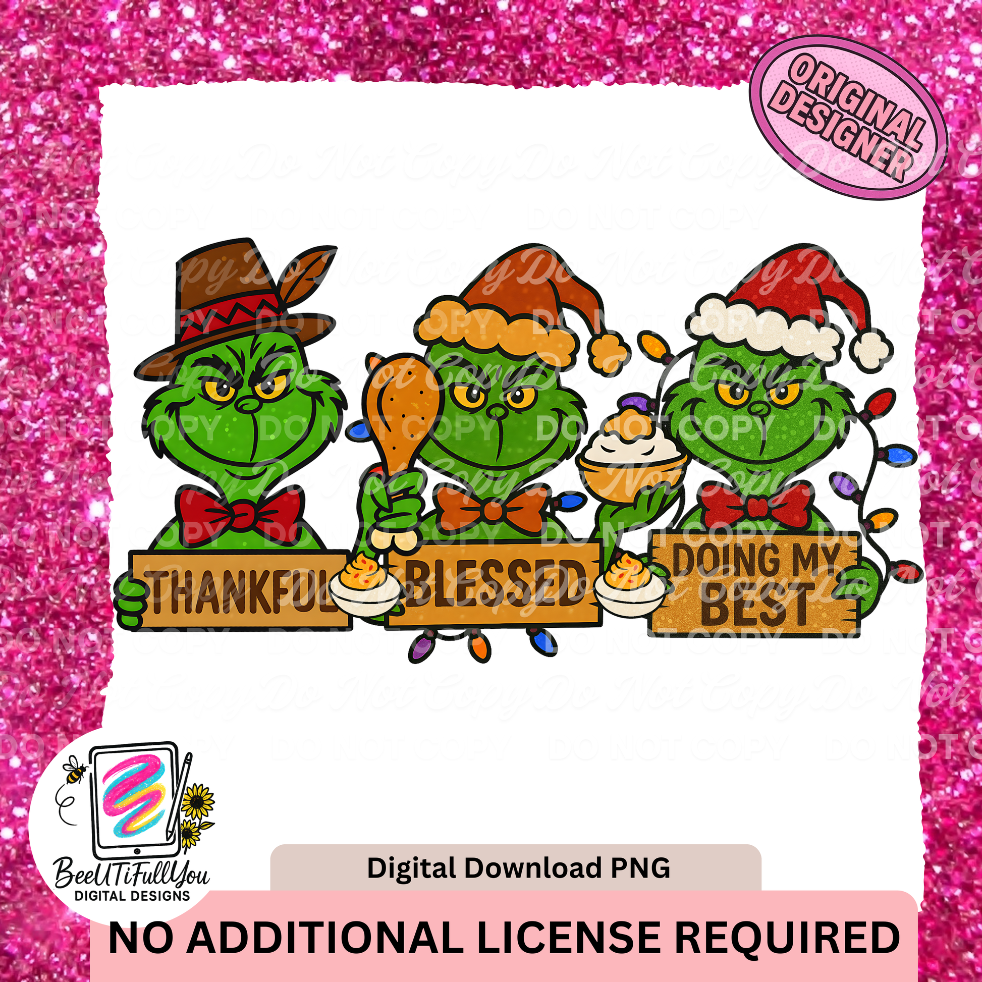 Feeling festive and a little frazzled? This Funny Grinch Thanksgiving PNG Design says it all โ Thankful. Blessed. Doing My Best. ๐โจ