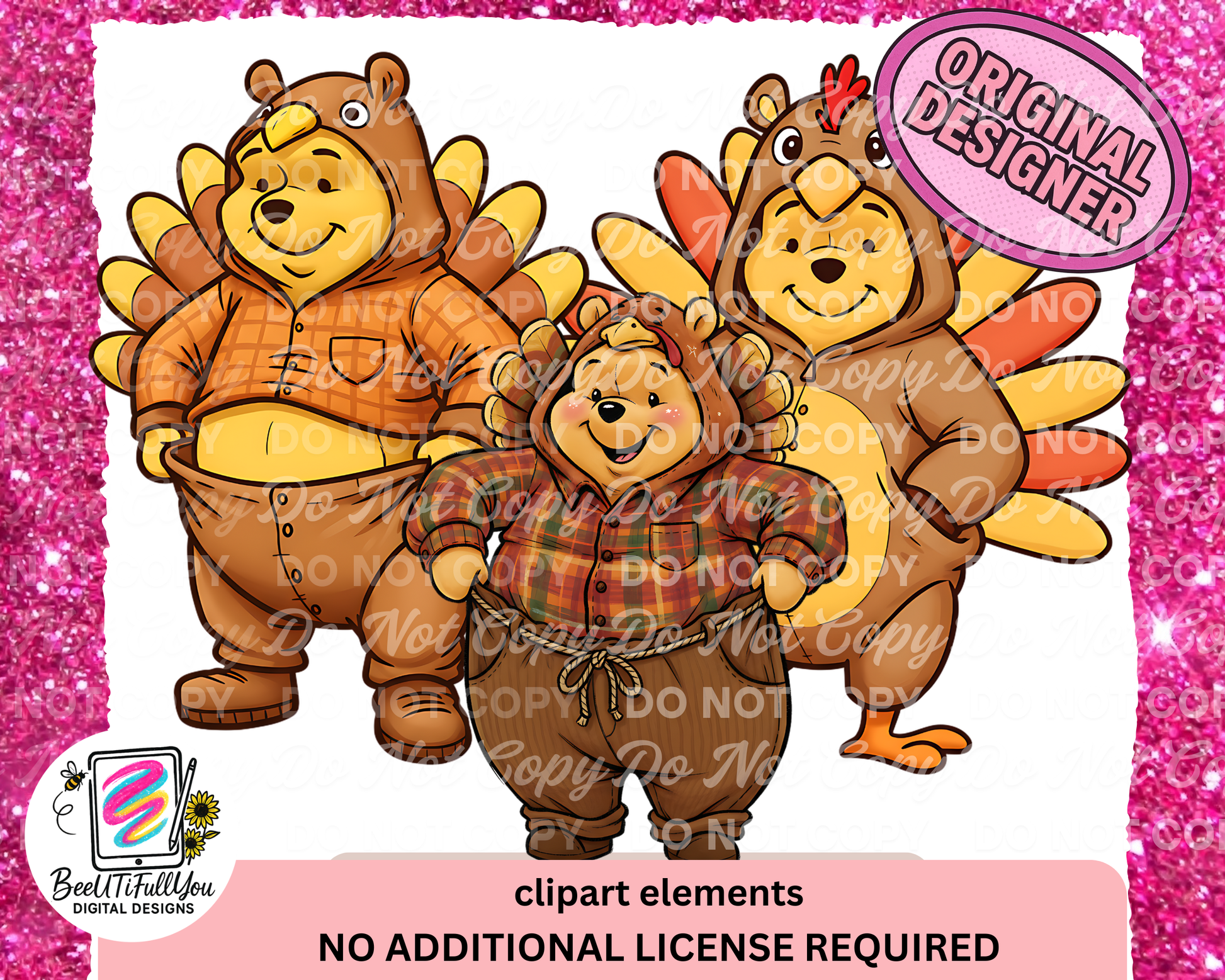 This digital clipart set includes a trio of hand-drawn, plaid-wearing bear characters dressed as turkeys β each one with unique expressions, warm tones, and fluffy details that capture that festive fall spirit. Perfect for designing Thanksgiving-themed shirts, stickers, cards, invitations, and printable decor, these original BeeUTiFullYou elements are ready to make your designs stand out with personality and charm.