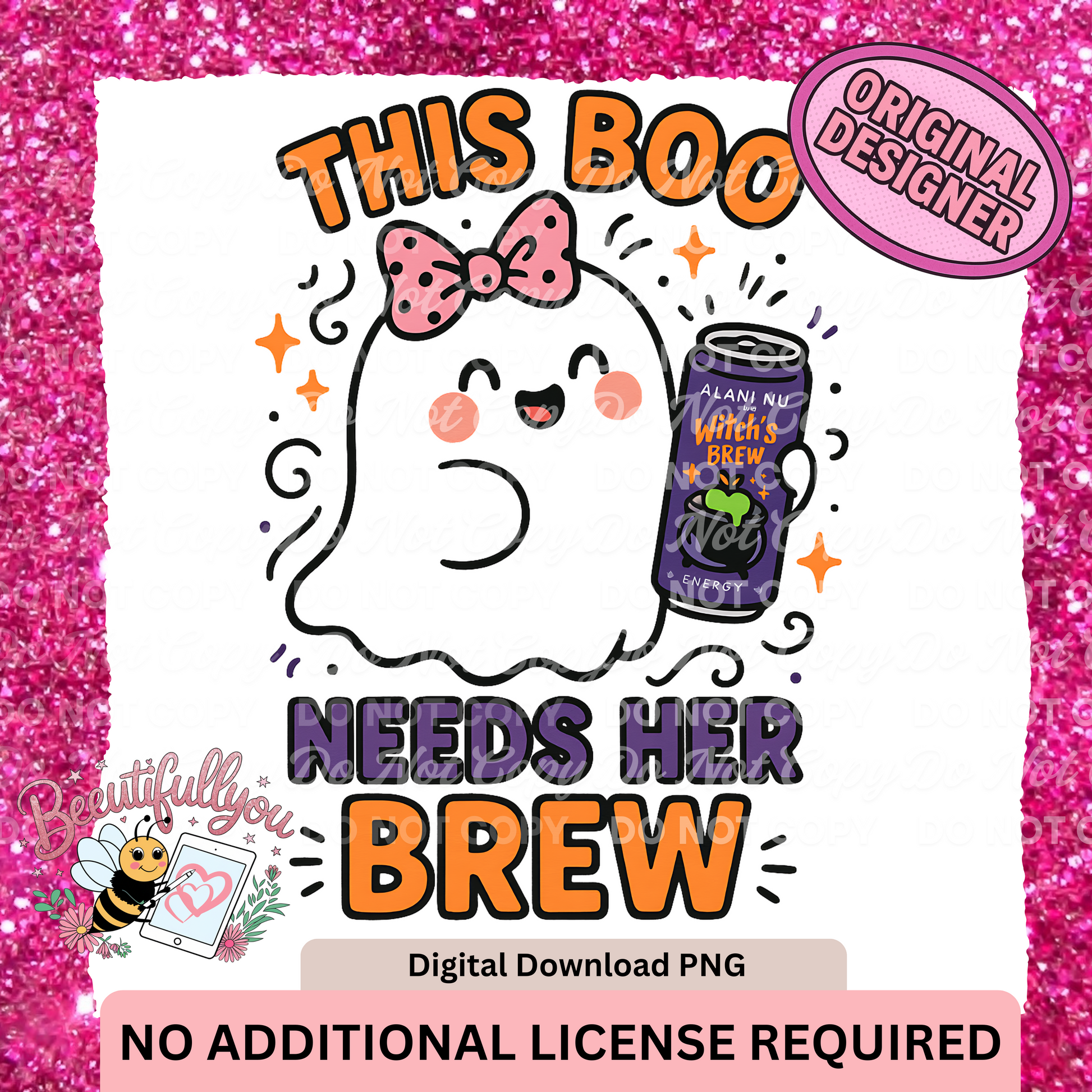 This Boo Needs Her Brew | Cute Ghost with Energy Drink PNG Design | No Additional License Required