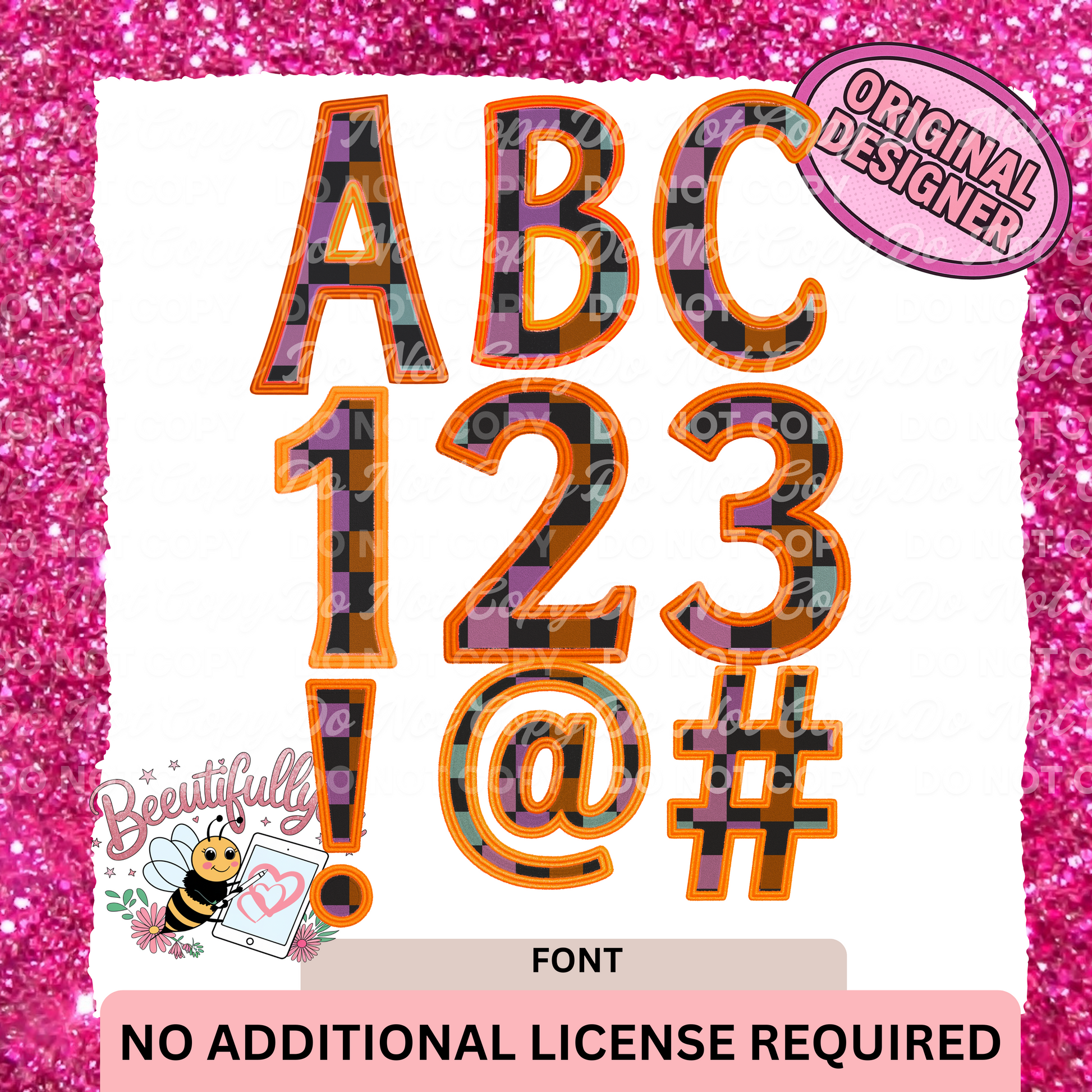 Includes AโZ uppercase letters, 0โ9 numbers, and symbols (!, @, #). Orange plaid Halloween-themed with a black outline โ great for names, monograms, and accents.