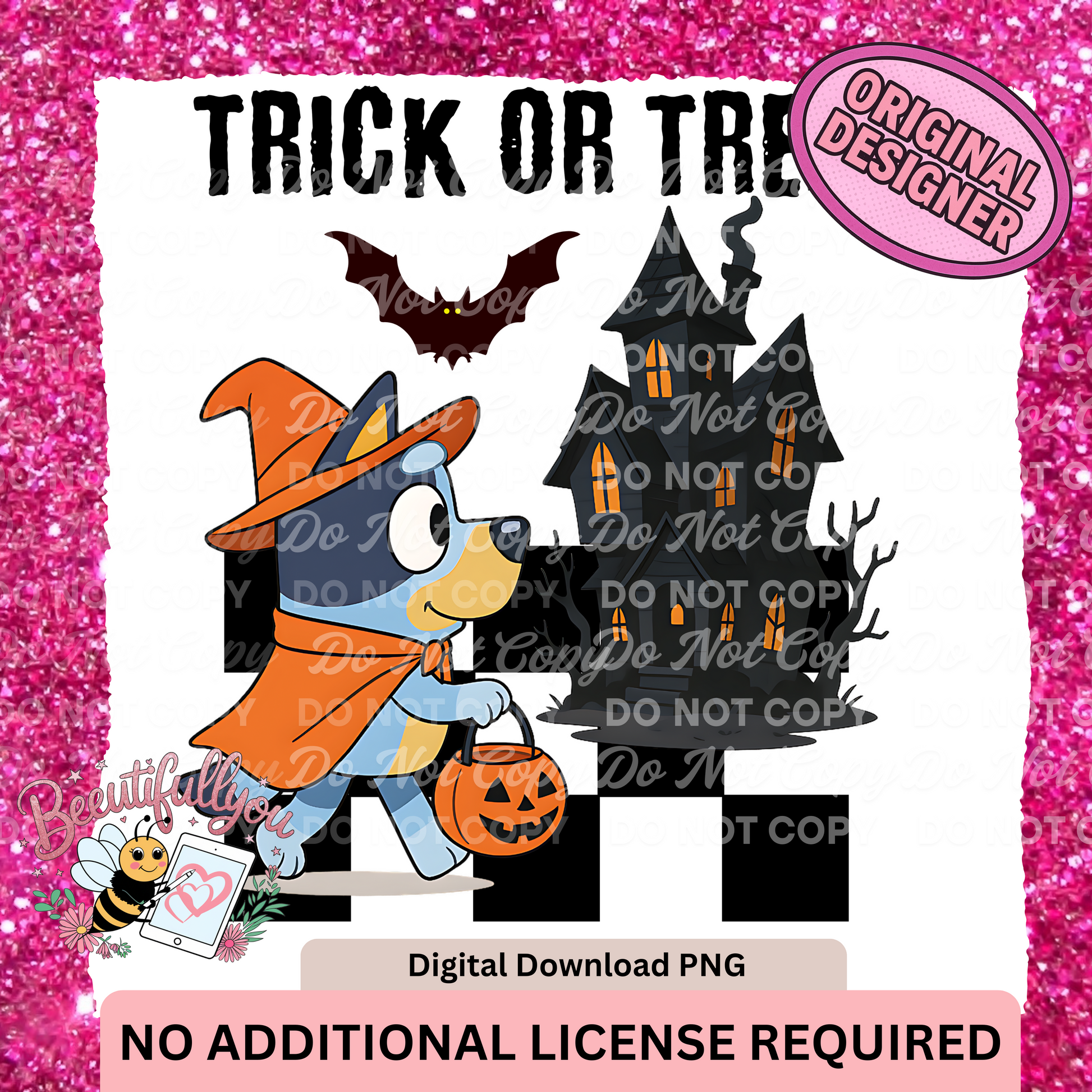Get spooky and adorable with this "Trick or Treat" Halloween PNG featuring a cute blue dog dressed as a witch, carrying a pumpkin pail, and walking past a haunted house under flying bats. Perfect for shirts, totes, mugs, and seasonal crafts. High-quality digital download, ready to use for sublimation or printing.