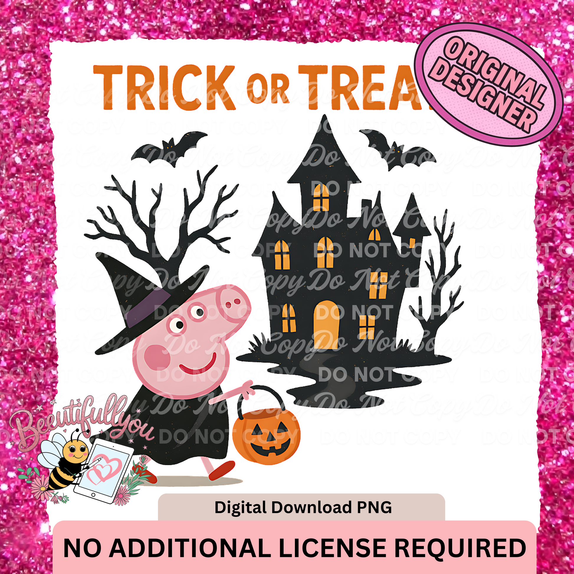 Trick or Treat Halloween PNG | Pig Witch with Haunted House Digital Download