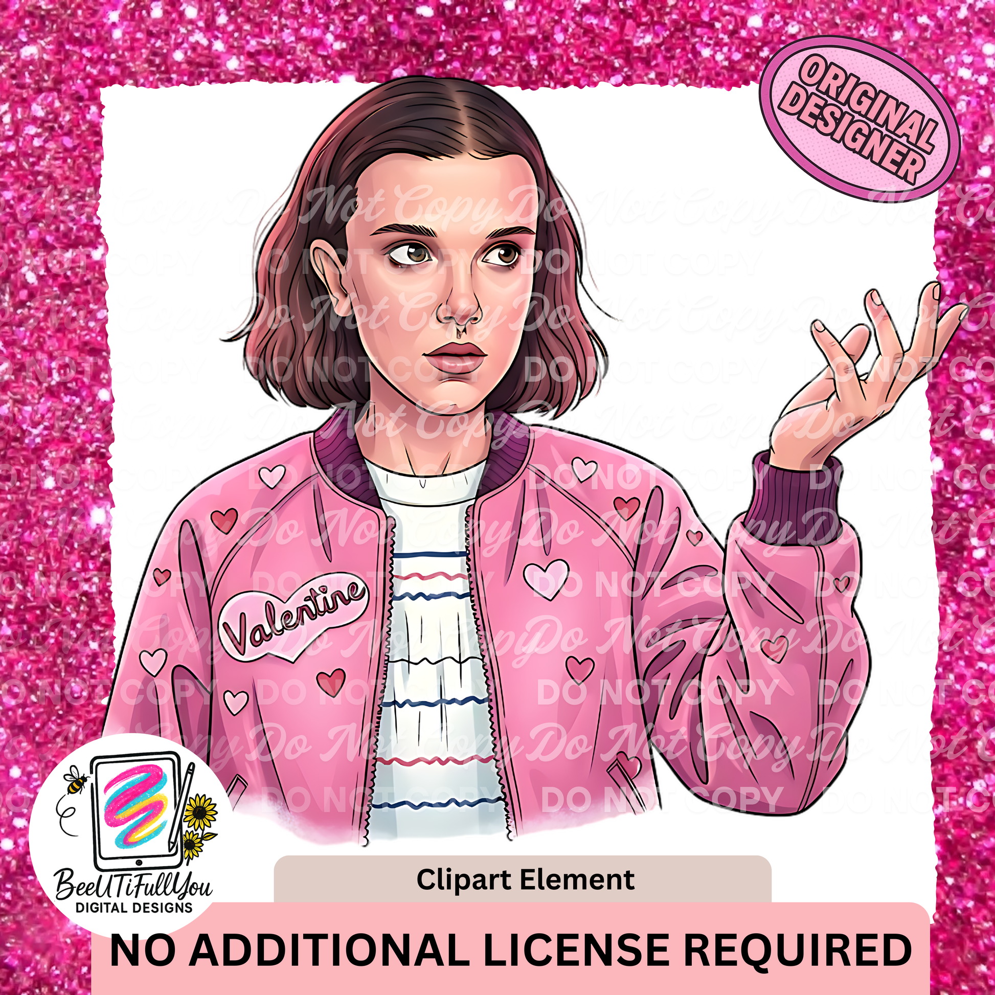 This listing includes 2 high-quality hand-drawn clipart elements featuring a pink Valentine-themed Demogorgon and a Valentine jacket Eleven. Perfect for creating your own finished shirt designs, stickers, sublimation prints, posters, tumblers, and more. These are clipart elements only, not finished designs.