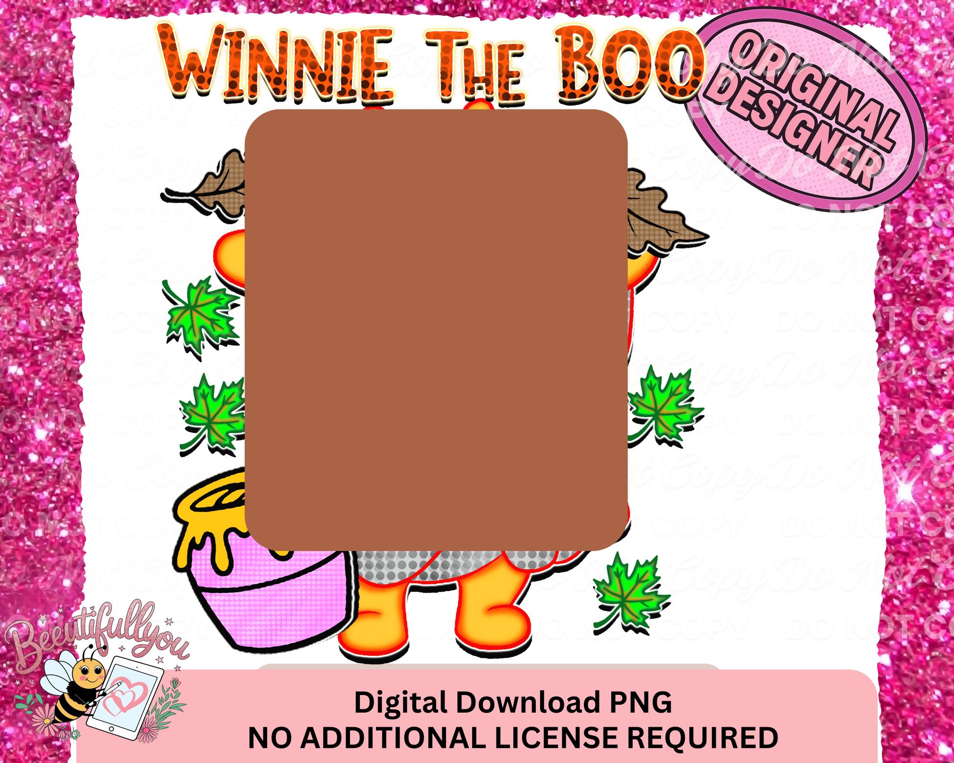 Say boo to basic with this hilarious and adorable “Winnie the Boo” Halloween PNG by BeeUTiFullYou! Featuring a bear-inspired character dressed in a ghost sheet, holding fall leaves, and surrounded by honey and autumn vibes, this quirky design brings humor and cozy fall charm to your Halloween collection.