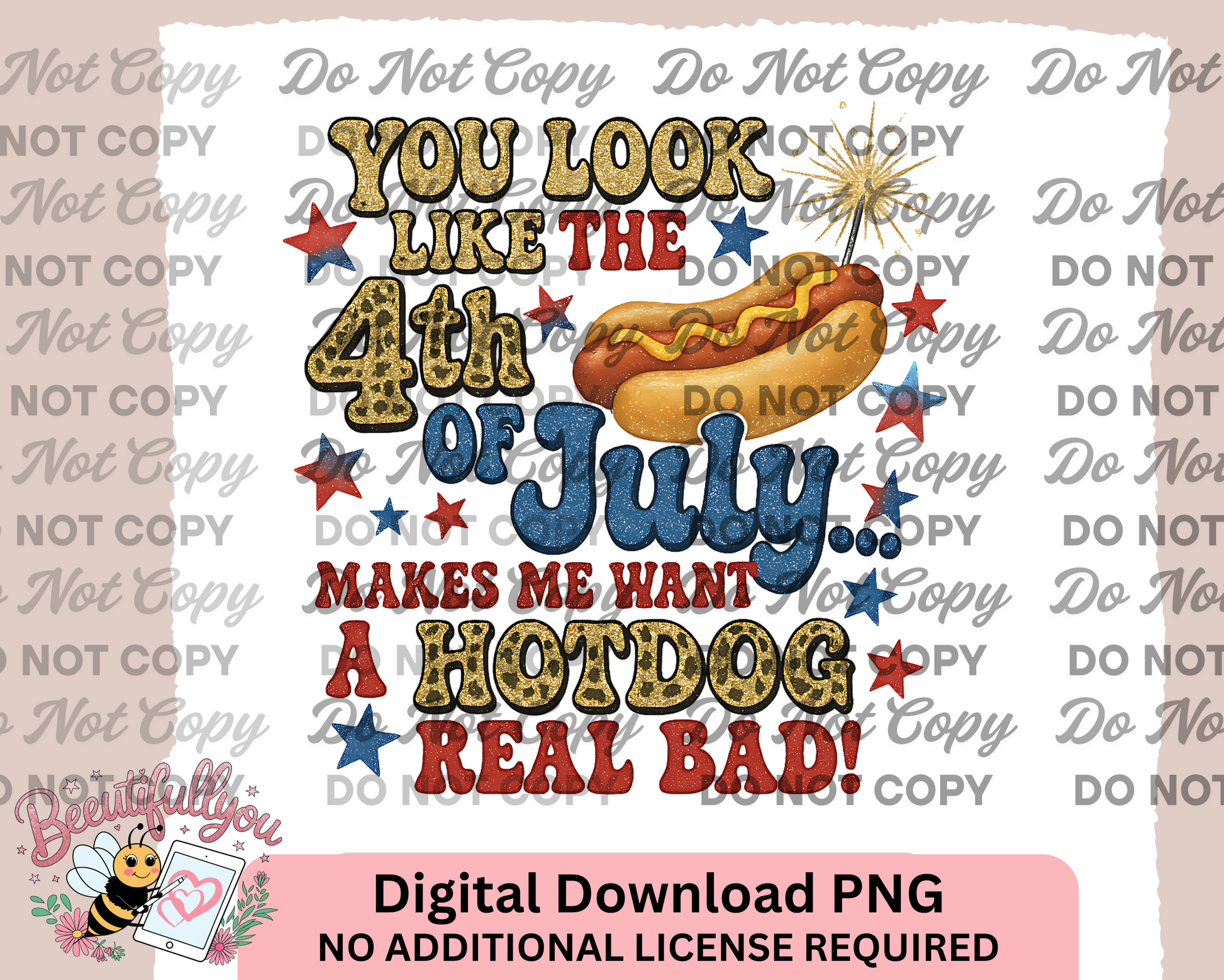 “You look like the 4th of July… makes me want a hotdog real bad!” A hilarious nod to a cult classic line, this design includes glittery text, patriotic stars, and a juicy hotdog front and center.