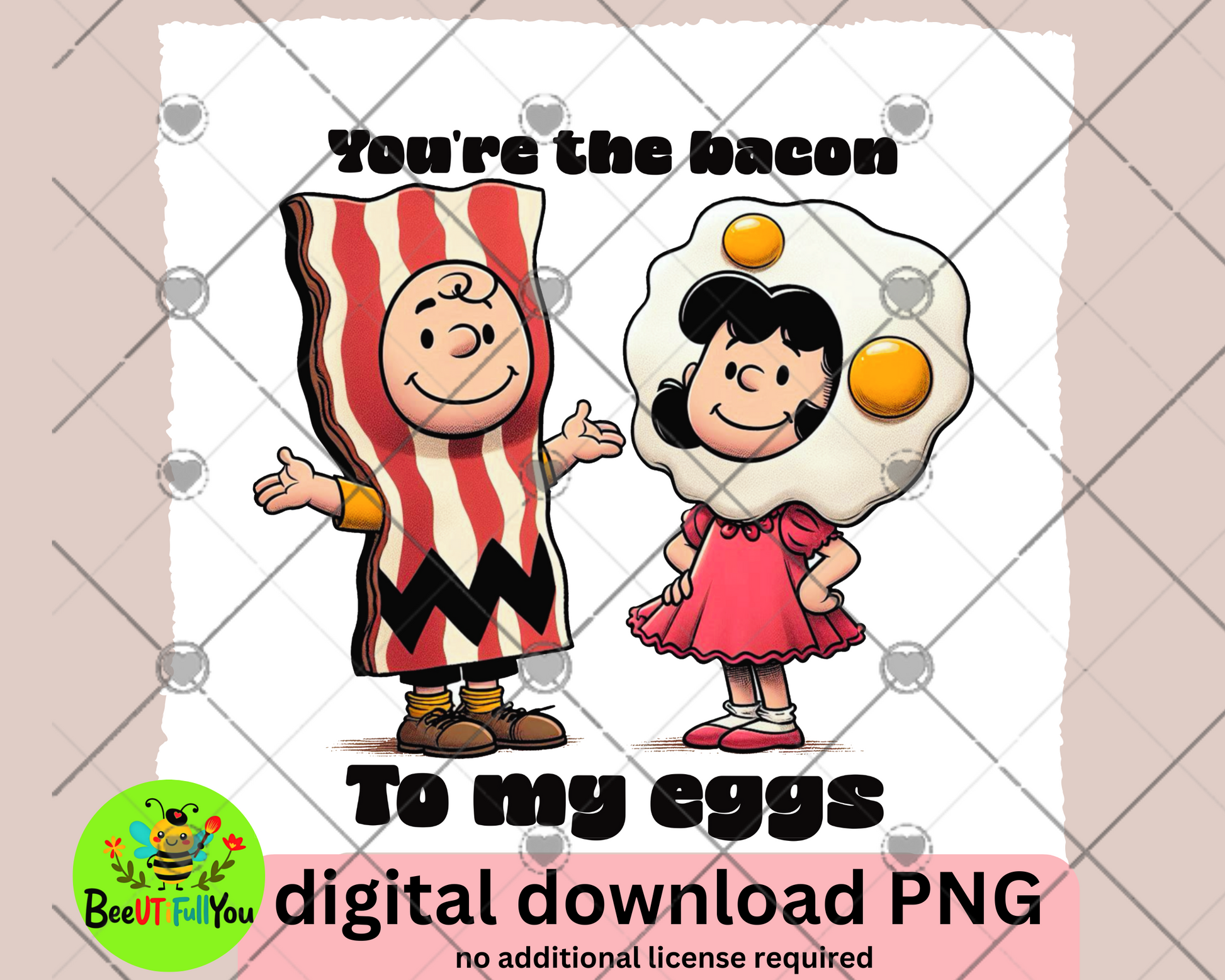 Add a dash of humor and sweetness to your Valentine's Day projects with this adorable "You're the Bacon to My Eggs" design. Featuring a playful pairing of bacon and eggs personified, this high-quality PNG file is perfect for t-shirts, mugs, cards, and more. Ideal for couples who love a quirky and lighthearted design.